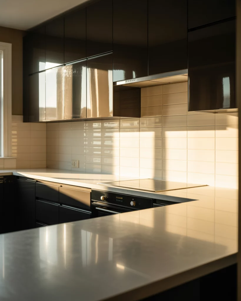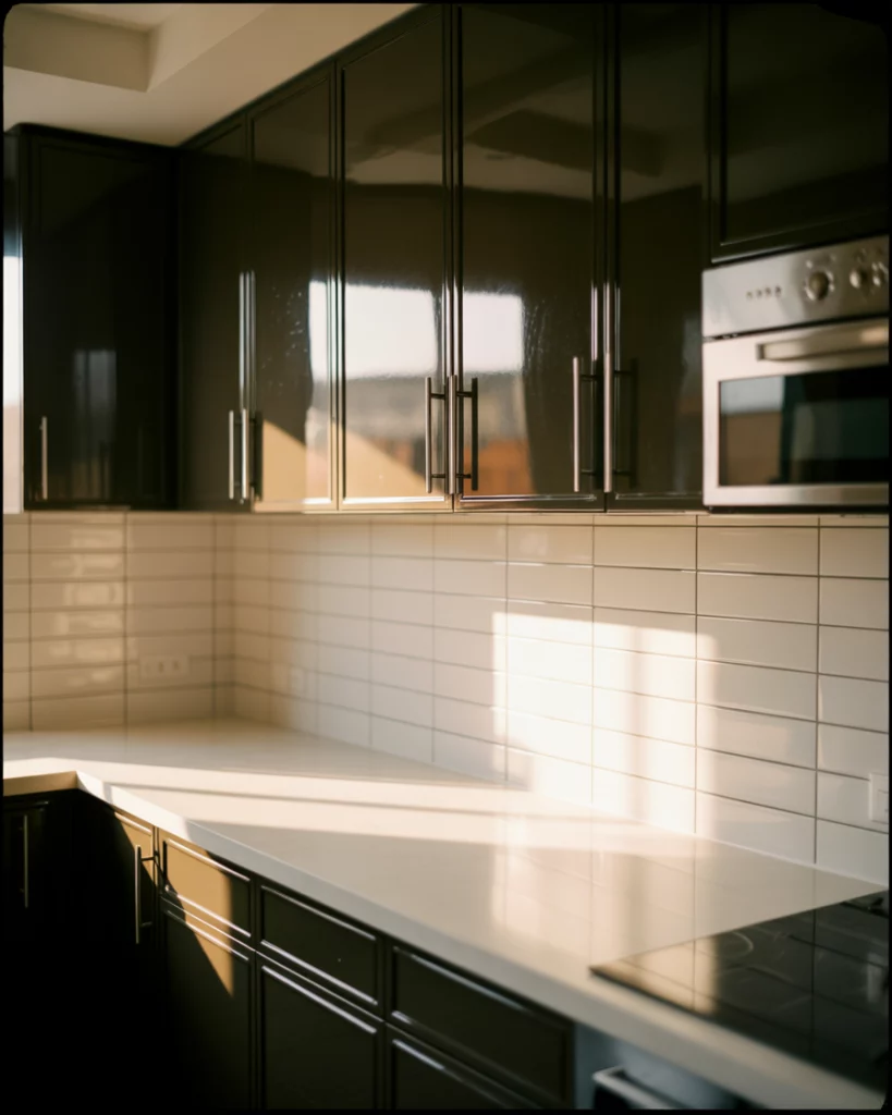 16 High-Gloss Black Cabinets in a Compact Kitchen