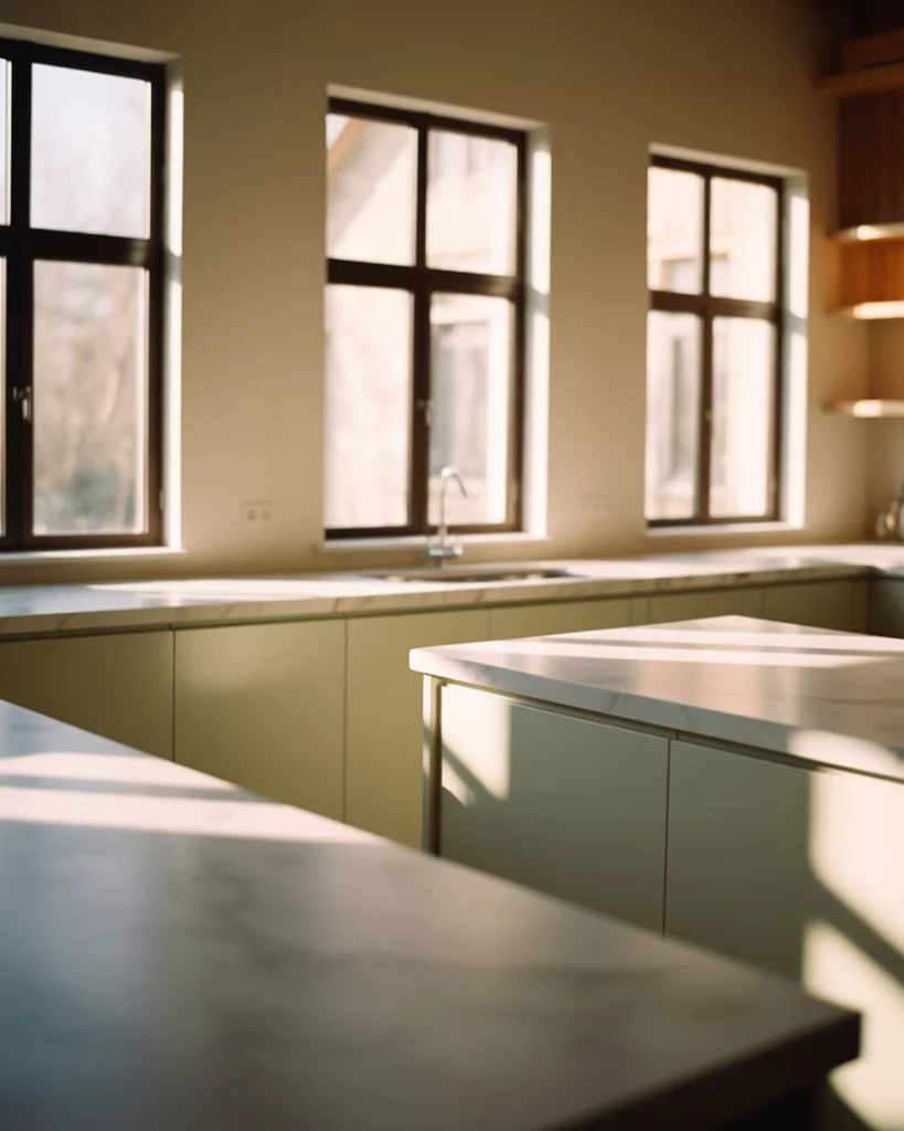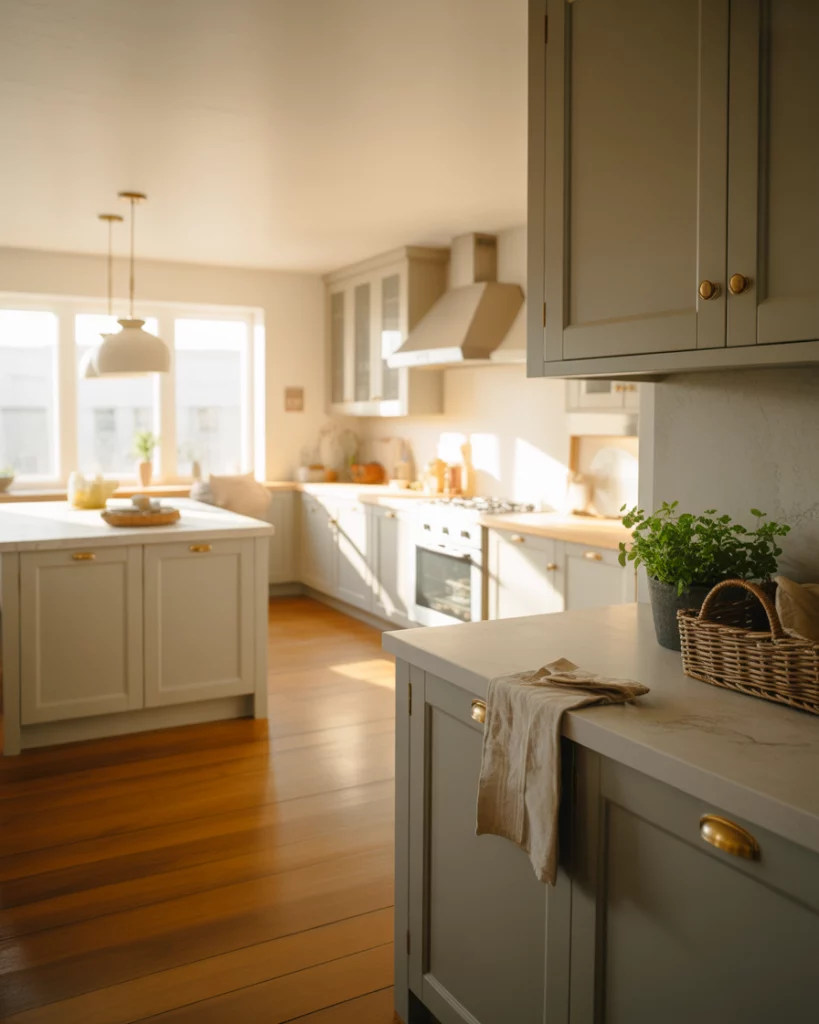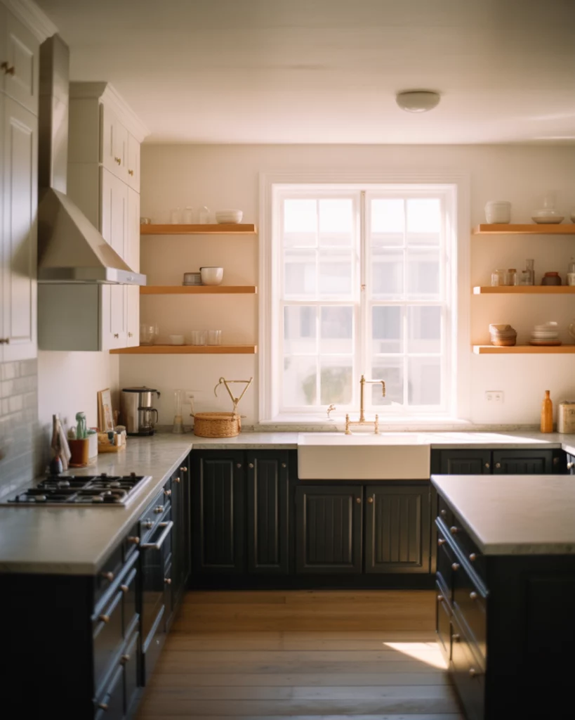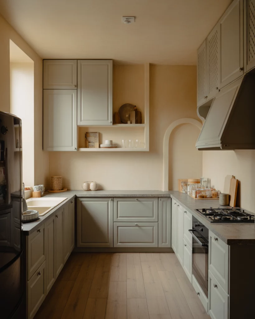 And, in contrast, you could always opt for a softer contrast by using grey and off-white tones. Couple it with soft design ideas, light-colored floorings, and grey cabinetry. This would make the design perfect for those who like a subtle contrast setting, like the black and white theme.