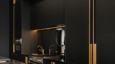 In smaller kitchens, the use of high-gloss black cabinetry can create stunning contrast and reflect light. Mix and match the black cabinetry with light décor ideas, sophisticated backsplash designs, and modern design elements, ensuring the space doesn’t appear too heavy. The effect provided by the light-reflecting surfaces helps the rooms appear larger.