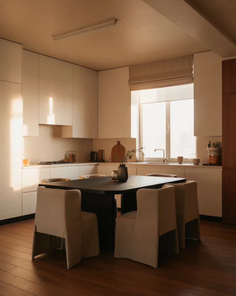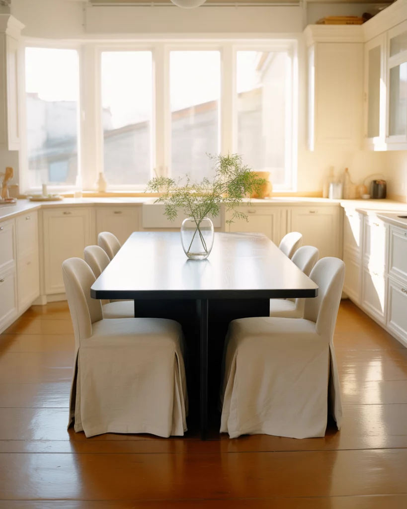 A stunning contrast in the light-filled room gets added through the use of the black kitchen table. The contrasting table works wonders in the room and gets paired well with the use of light-colored cabinetry, interesting décor, and table settings that don’t overcrowd the space. The effect provided by the contrasting table appears warm and inviting.
