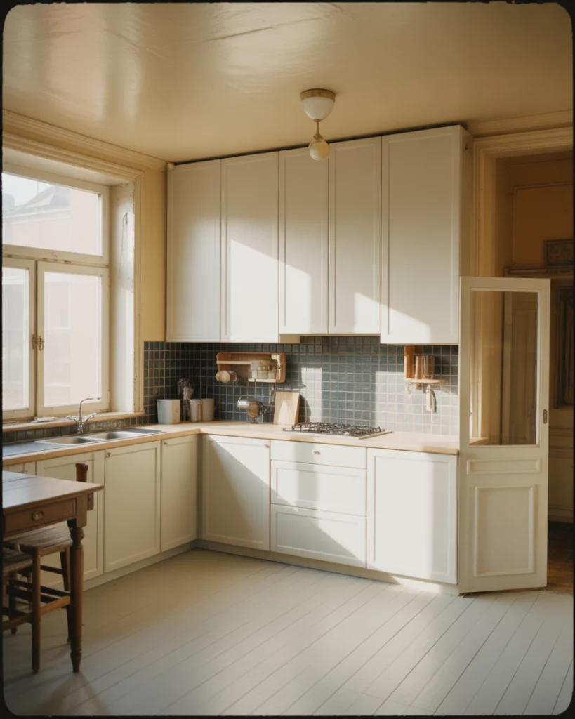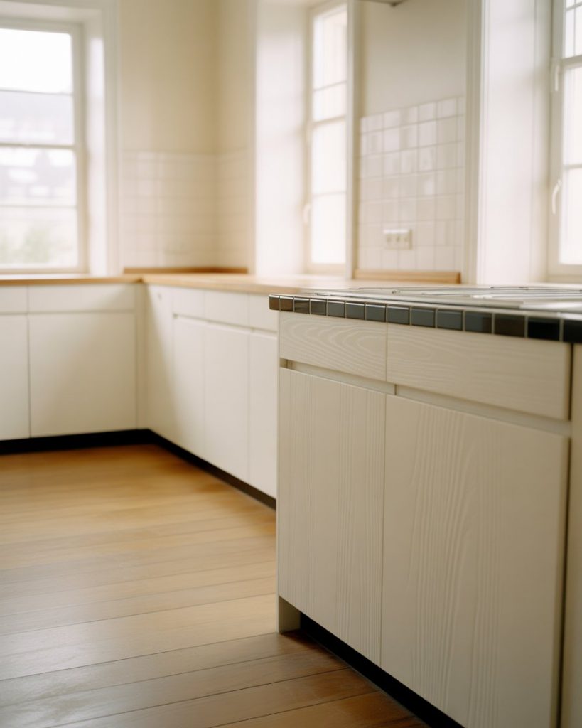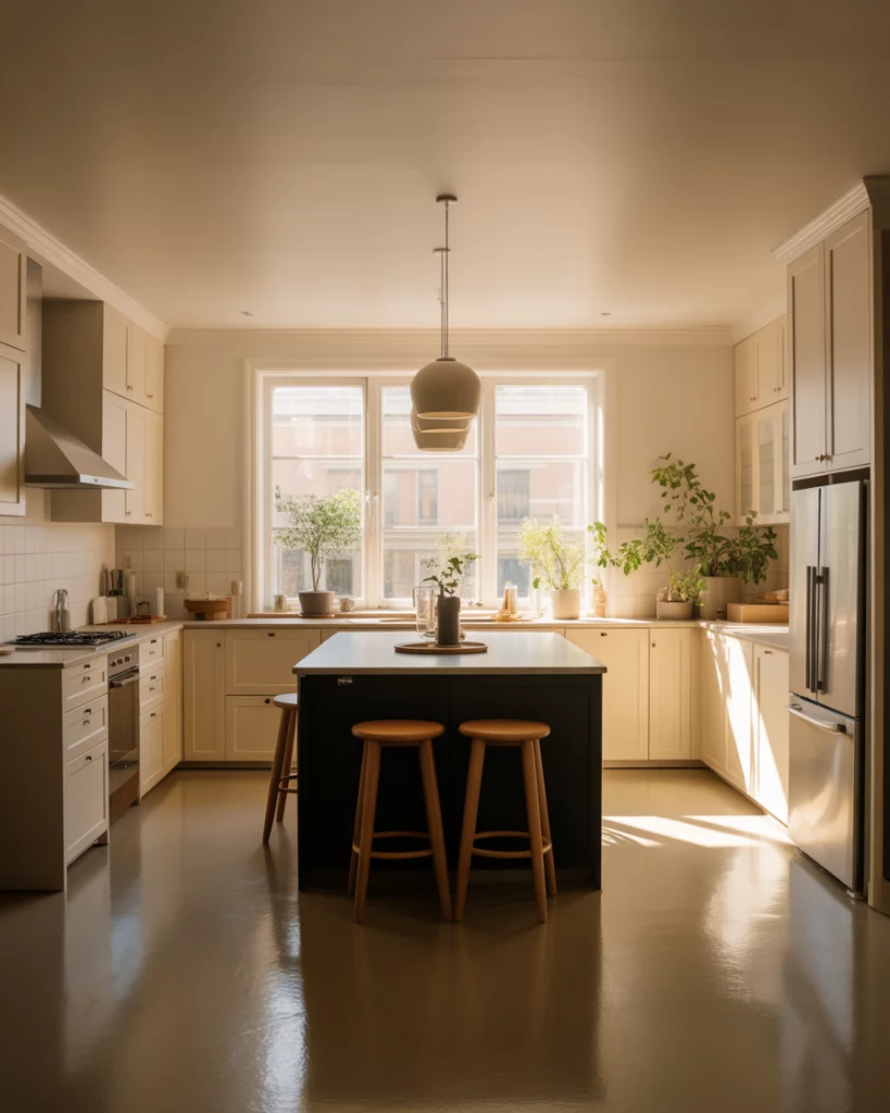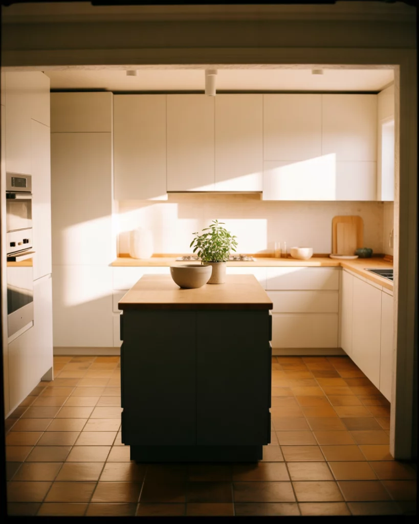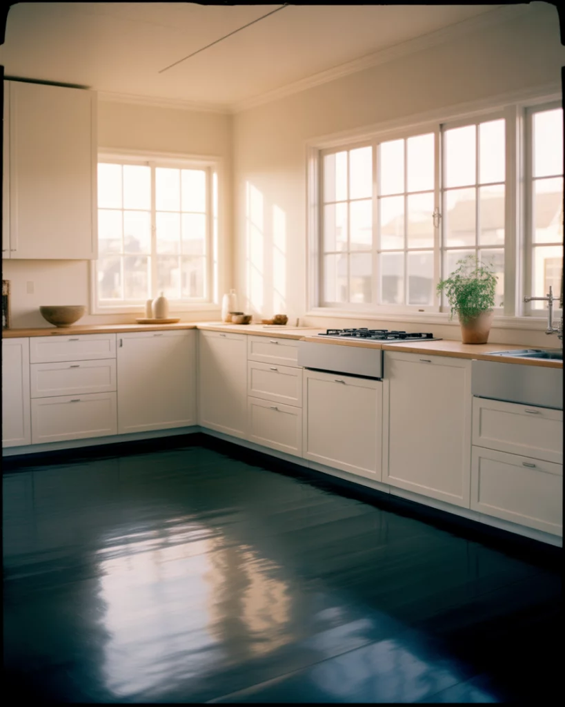There’s no need for an all-black floor in the kitchen when you can create stunning contrast through light inlays and patterned flooring. Mix and match light floor designs, modern tile designs, and light décor ideas, ensuring the effect provided appears balanced and light. The effect provided by the contrast gets an interesting twist, making the space appear light and pleasant.