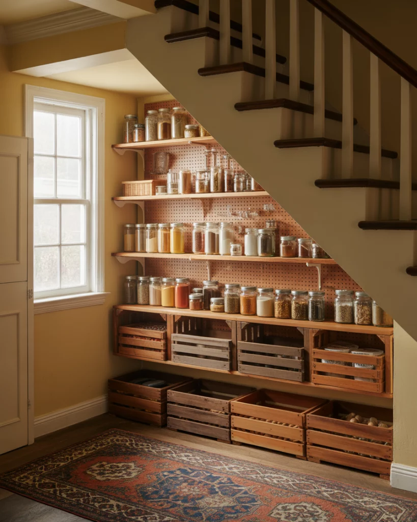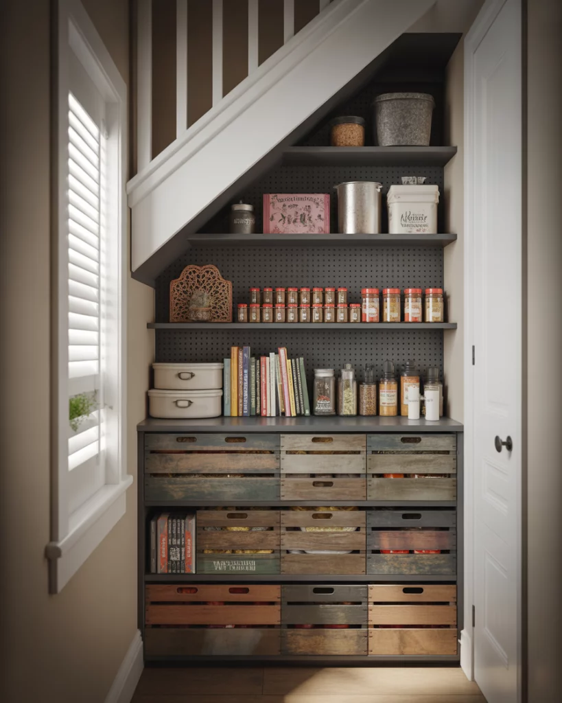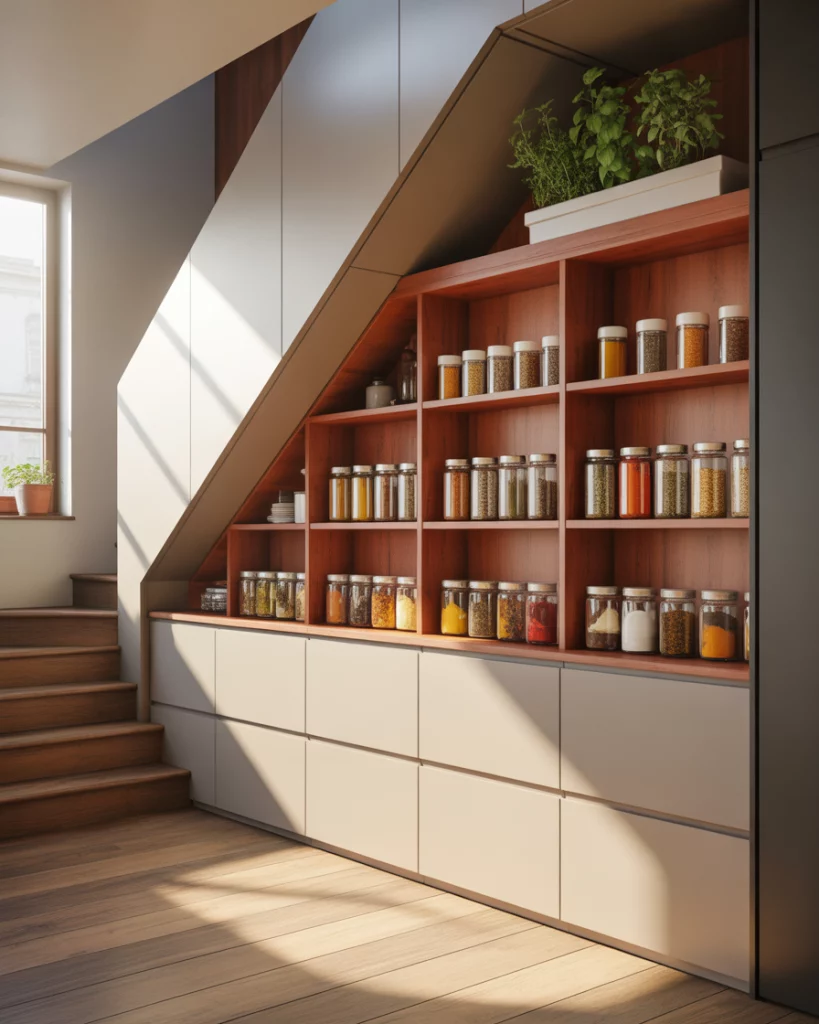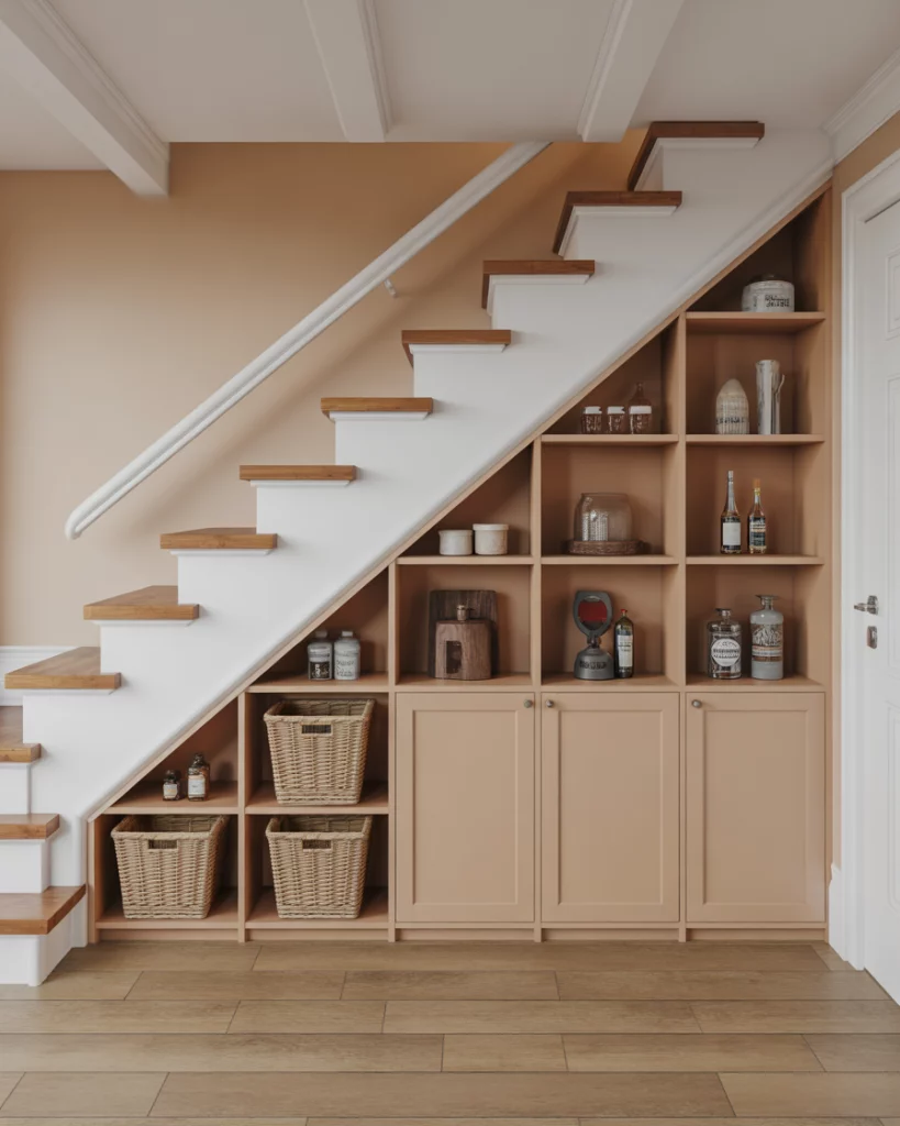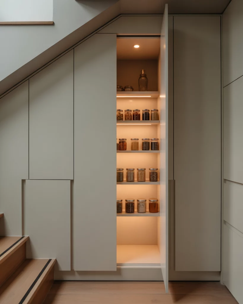 Merge minimalist design with functionality using a concealed under stairs cupboard. Flat cabinet doors, push latches, and seamless panels hide your pantry perfectly. It’s ideal for small spaces or homes chasing that “hidden kitchen” vibe. I’ve seen architects at Dezeen highlight this approach for urban apartments.