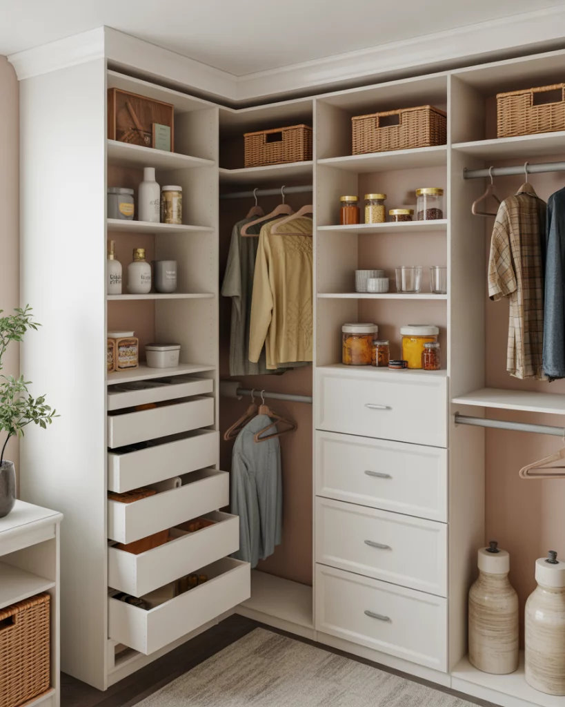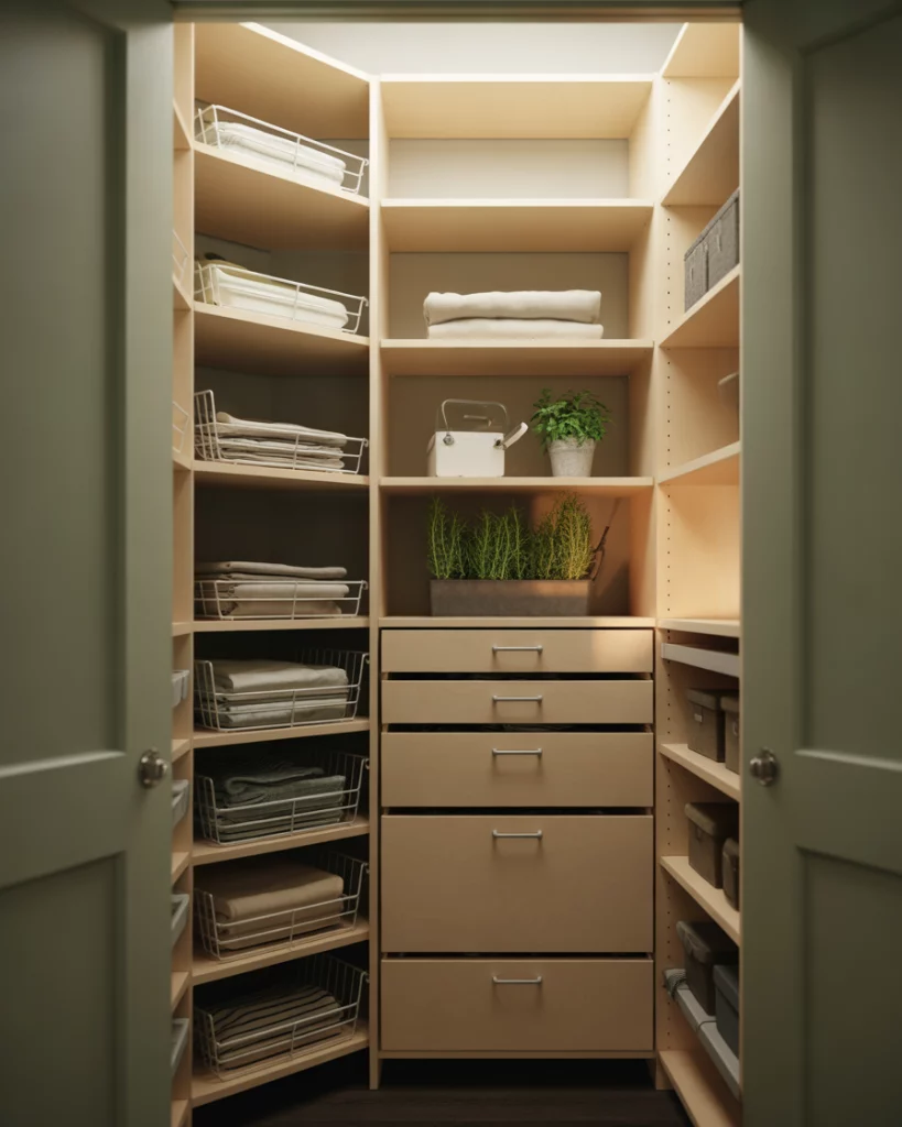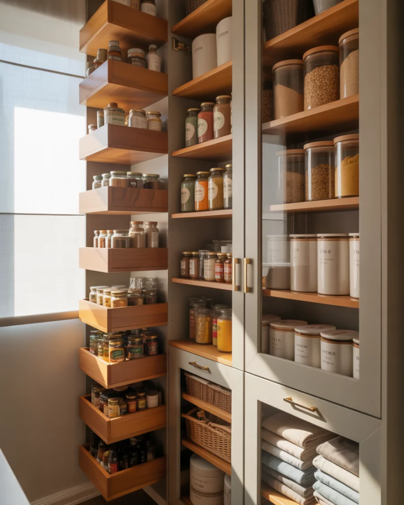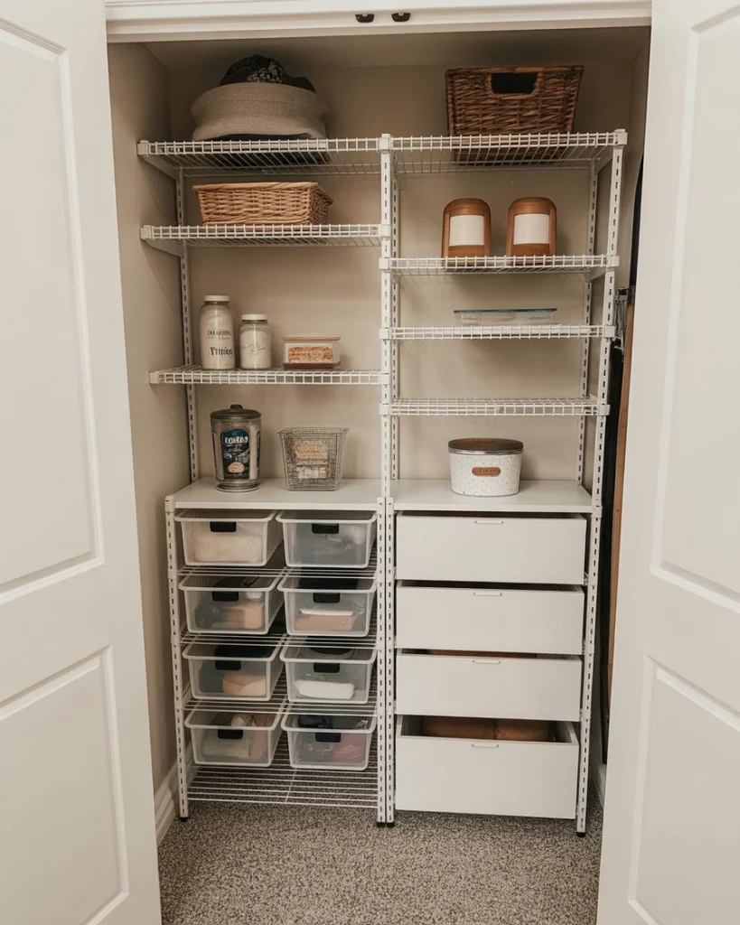 Transform a closet into a pantry by fitting it with tiered cabinets and pull-out drawers. Perfect for compact homes, it hides clutter behind doors while keeping staples handy. My neighbor turned her laundry closet into a dual-purpose storage area with labeled drawers for grains and snacks.