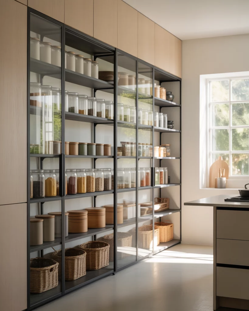 The modern pantry of 2026 blends transparency with shine. Think sleek glass shelves framed in matte black or brushed nickel, perfectly aligned inside a walk-in or open kitchen layout. This approach feels light yet bold—great for displaying jars and cookbooks. I once saw this style in a high-end condo where reflective surfaces made the pantry seem twice as large.