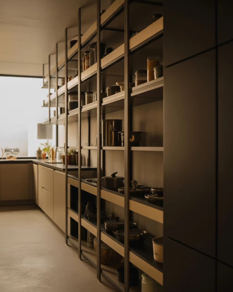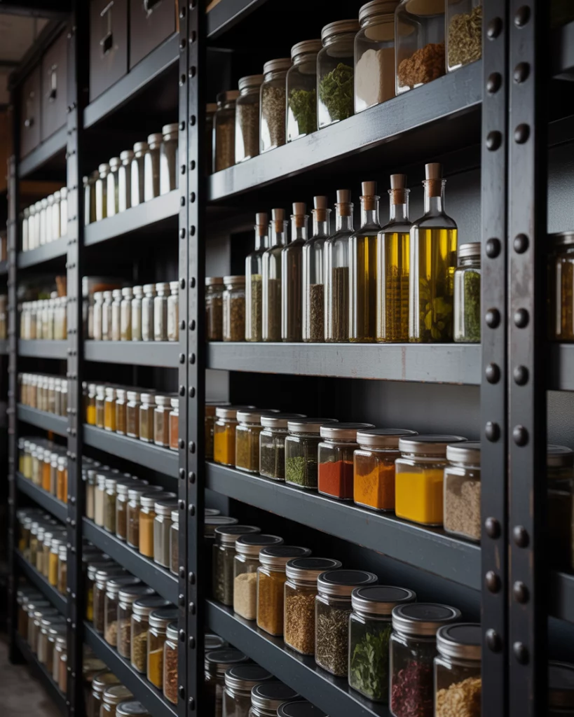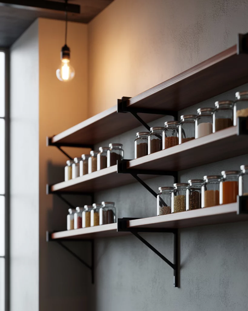 The 2026 industrial trend mixes metal, glass, and concrete textures. Open shelving with concrete backing or countertops feels bold and urban, perfect for lofts or city apartments. I once photographed a pantry in Chicago where concrete shelves anchored a wall of black metal brackets—a sculptural statement.