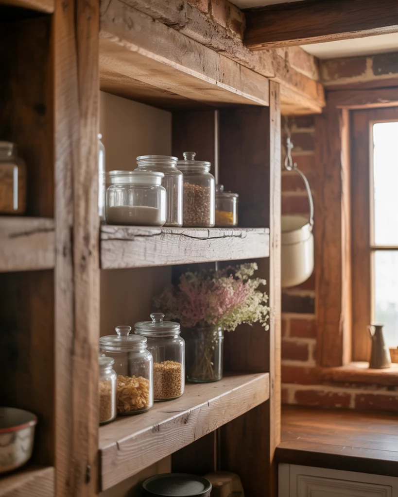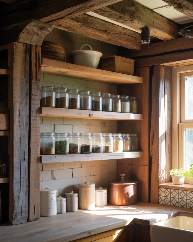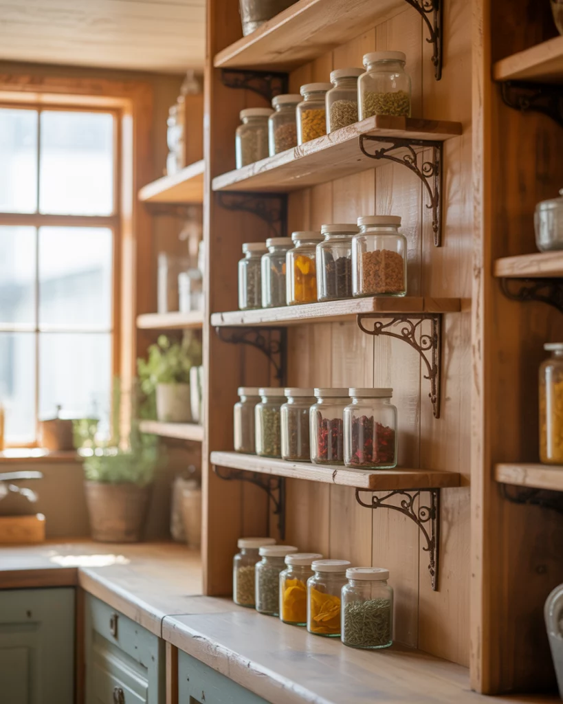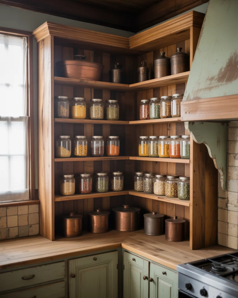 Corners tend to be overlooked—this is where the rustic corner shelving solution steps in. You can design pie-slice or L-shaped wood shelves, maybe reclaimed timber, that fill a corner pantry or nook. Underneath, you can hang hooks for mugs or kitchen gadgets. Once I visited an old farmhouse where the corner shelves were made prominent by the display of copper pots and glass jars.