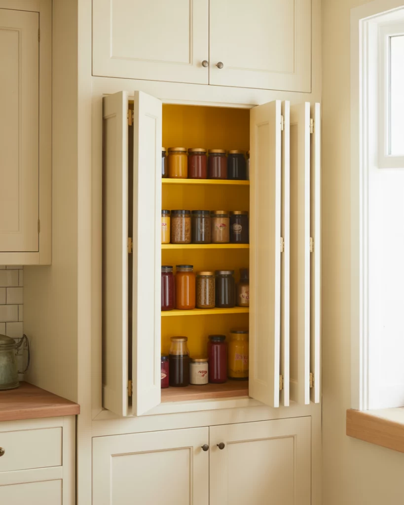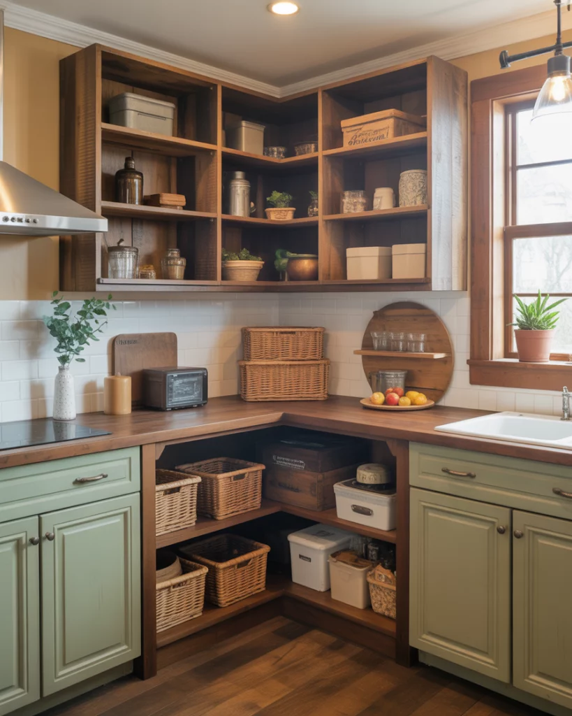 A small corner cupboard can completely transform awkward kitchen angles. Use built-in shelving behind bi-fold or pocket doors to create a hidden gem for food storage. Paint the inside a bright color for surprise and depth. I once designed a corner cupboard in a bungalow that looked tiny from outside but fit an entire month’s groceries.