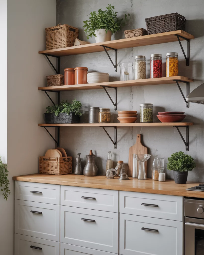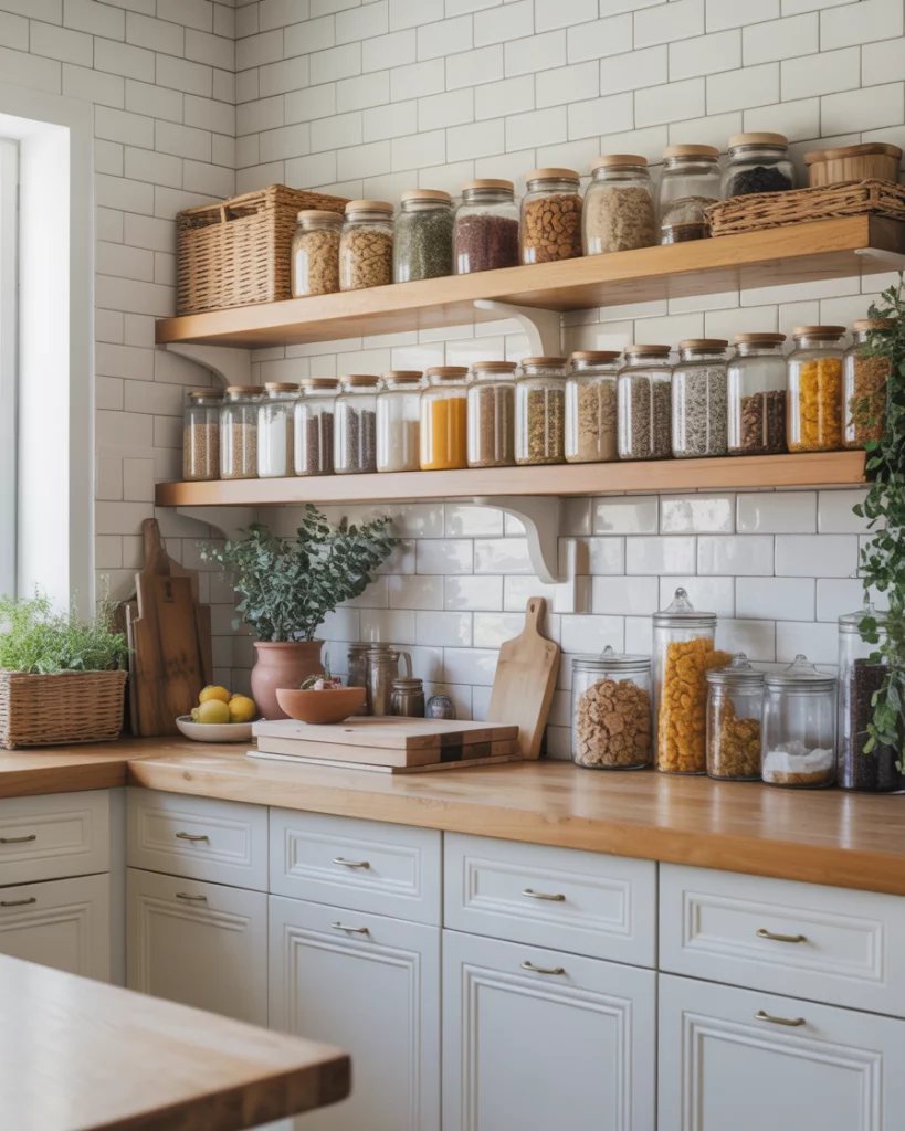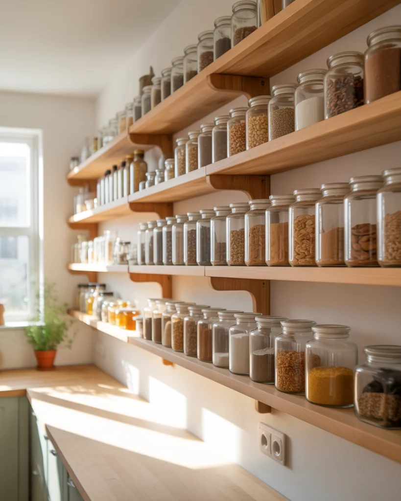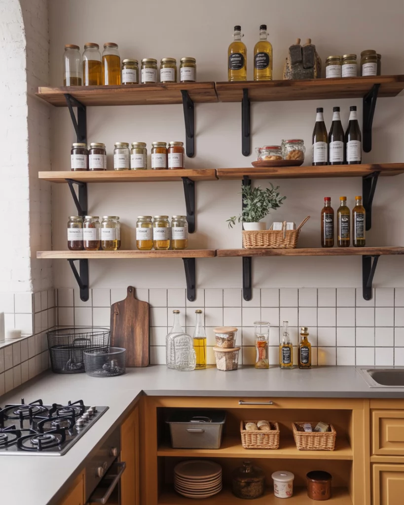 Show off your staples with pride. A food display wall converts part of an open kitchen into art—aligning jars, oils, and spices symmetrically on exposed shelves. This concept is especially trendy in minimalist and industrial kitchens. One client said guests always complimented her “grocery gallery.”