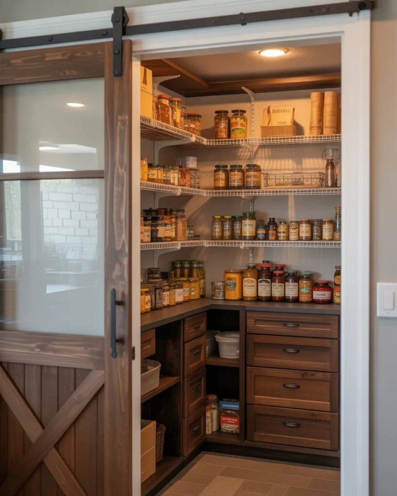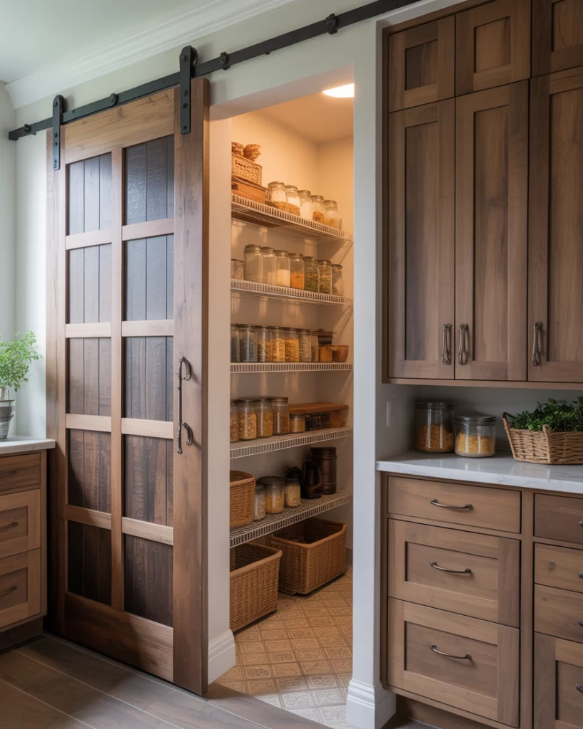Maximize access and elegance with a walk-in pantry behind sleek sliding barn or glass doors. Inside, mix wire, wood, and cabinets to balance rustic charm with order. I helped install one in a farmhouse remodel—the sliding door turned a simple pantry into a centerpiece.