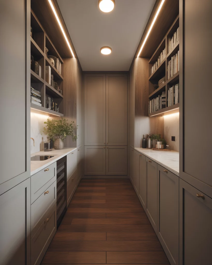 A narrow butler pantry corridor offers elegance in tight footprints. Combine built-in cabinets with vertical shelves and under-cabinet lighting to mimic a luxury passage. I saw one in a Charleston townhouse where glossy white finishes amplified the sense of space beautifully.