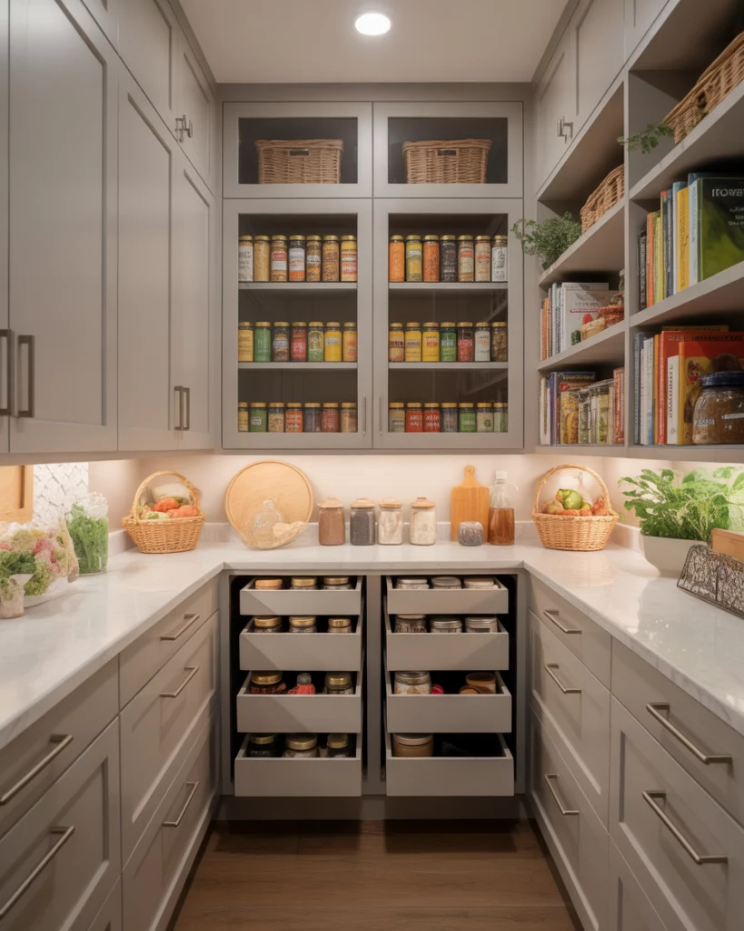 Channel the elegance of a butler pantry: enclosed cabinets with glass doors, pull-out drawers, and dedicated niches. In a walk-in or even narrow “butler corridor,” this approach brings polish and function. I recall seeing a remote estate’s butler’s pantry in Architectural Digest with exacting cabinetry and labeled jars. Add interior lighting for ambiance.