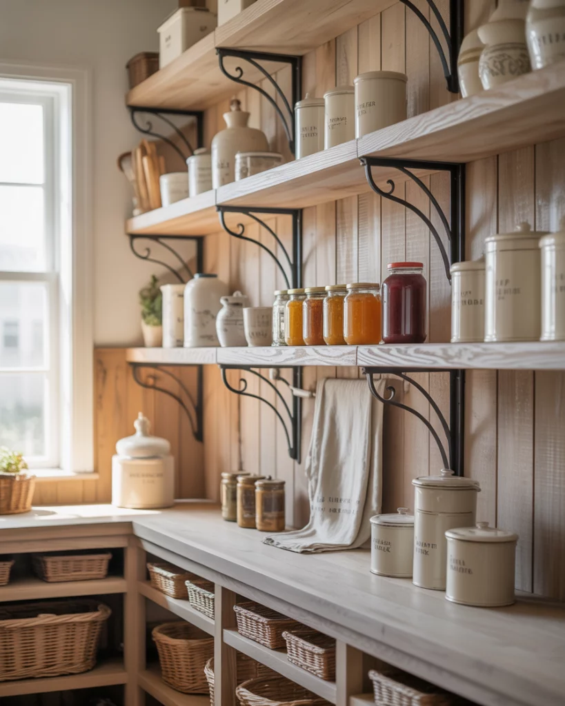 21. Open Kitchen Pantry Wall with Floating Shelves