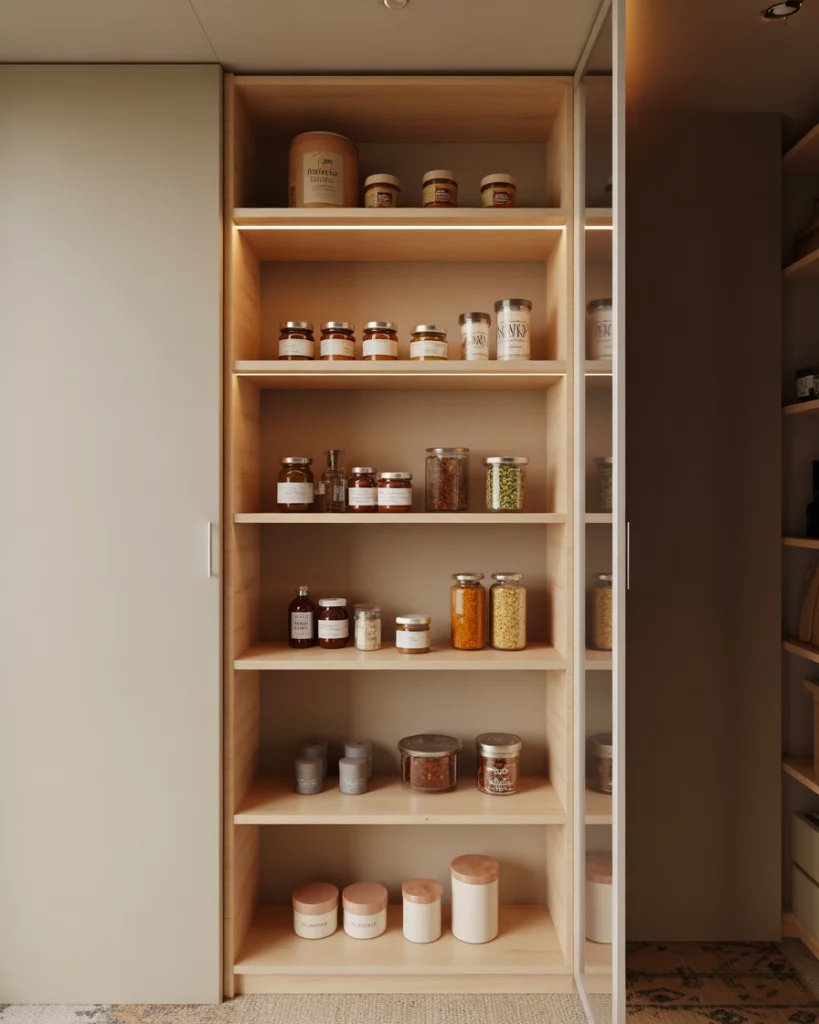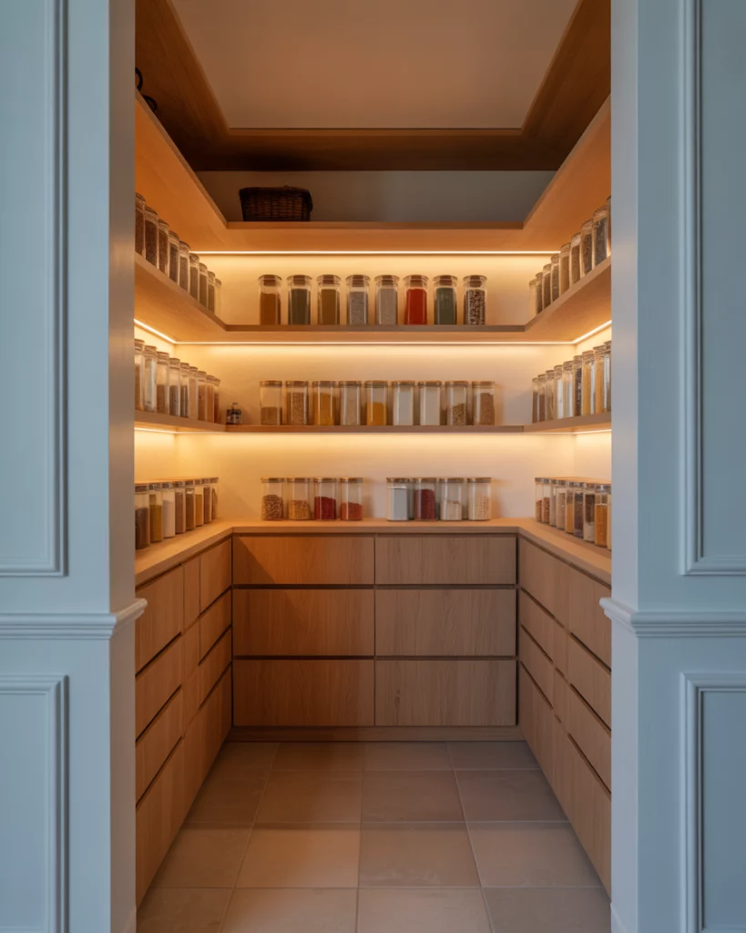 A built-in pantry becomes luxurious when paired with hidden LED lighting beneath shelves. This detail enhances visibility and creates ambiance, especially in walk-in or small closet spaces. I remember touring a model home where soft under-shelf lighting made even cereal boxes look like art pieces.