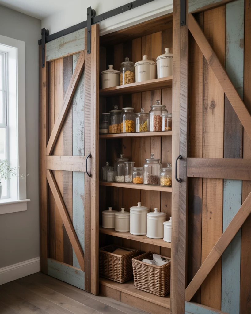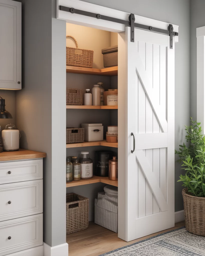 When every inch counts, convert a small closet into a pantry and install a rustic sliding barn door. The farmhouse-inspired design conceals clutter but adds charm. A friend of mine upcycled her old door and painted it sage green—now her pantry feels like a curated boutique.