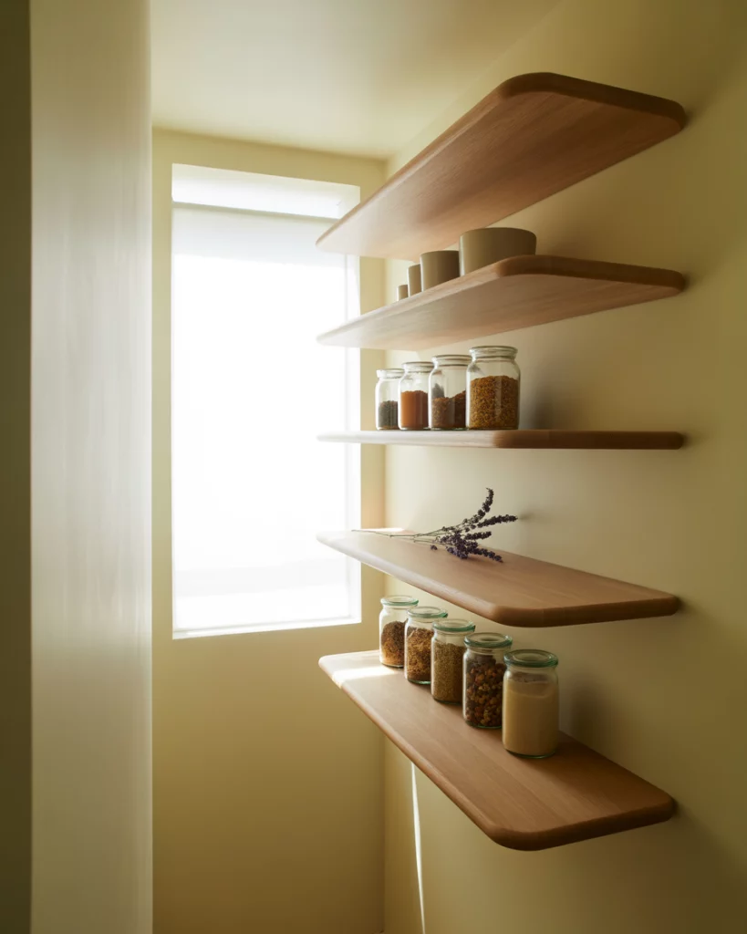 Minimalist design is a big trend in 2026. Pale, frameless floating shelves, usually painted the same color as the walls, create an effect of nothingness. This strategy does not visually increase the space of a small corner or walk-in pantry. To achieve harmony, use the same glass jars throughout. A designer I admire, Leanne Ford, oftentimes employs tonal interiors to make the objects “float” on the shelves.