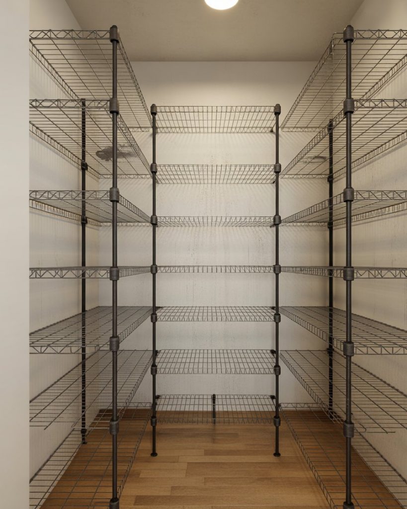If you want a more practical style then you could go for industrial wire shelving or metal grids (think black steel or powder-coated). These wire shelves are ventilation and visibility friendly and suited for a walk-in or small closet pantry. I was in a small loft in Brooklyn where open wire racks were making every jar and box visible and reachable. Give it a modern twist by pairing it with backlit LED strips.