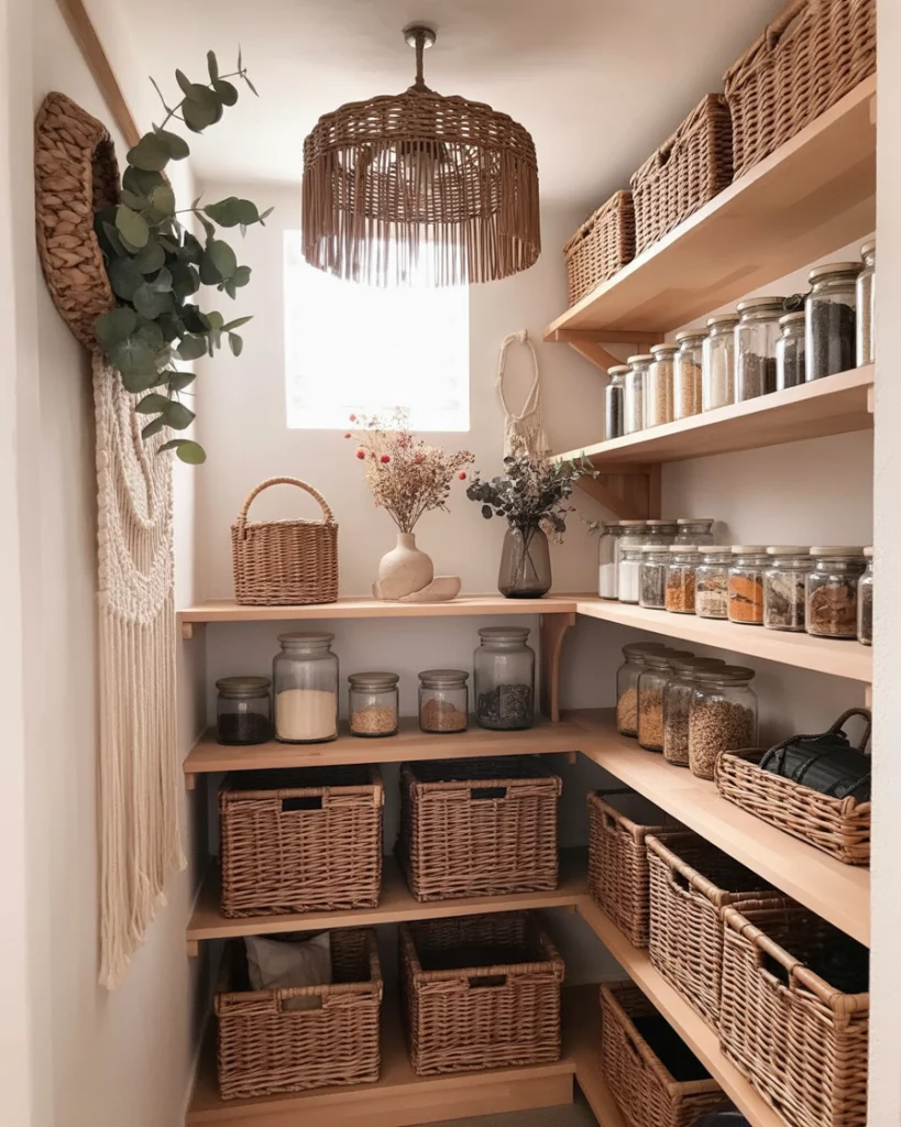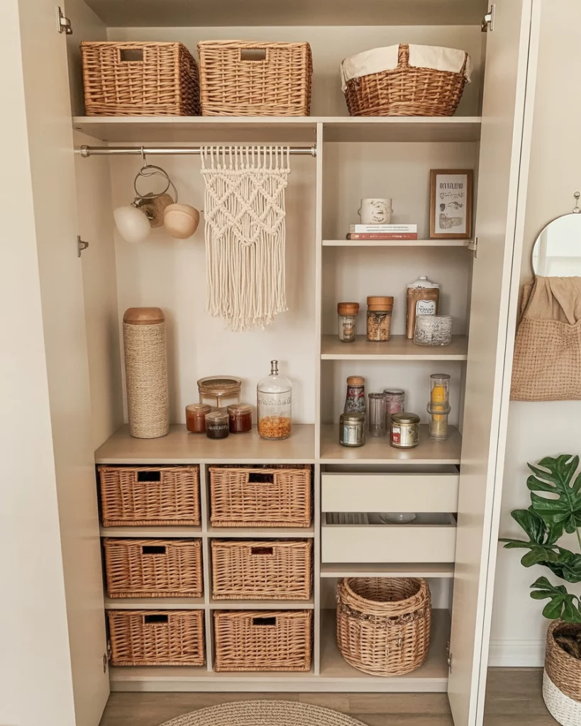 A boho pantry leans on natural textures, woven baskets, rattan bins, and mismatched ceramics. Within a closet or small closet pantry, use open and floating shelving, mix in macramé hanging baskets, and select warm woods and earthy tones. On a house tour, I saw this mix of texture instantly make a pantry feel cozy and lived-in.