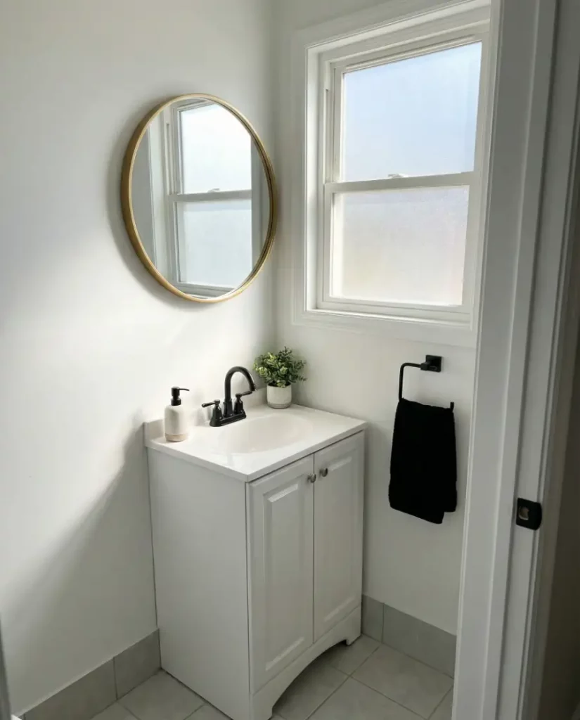 *Where it works best:* rentals with neutral tile or basic fixtures. Paint alone can transform the room, and blue is forgiving in low light bathrooms where a stark white can feel flat.