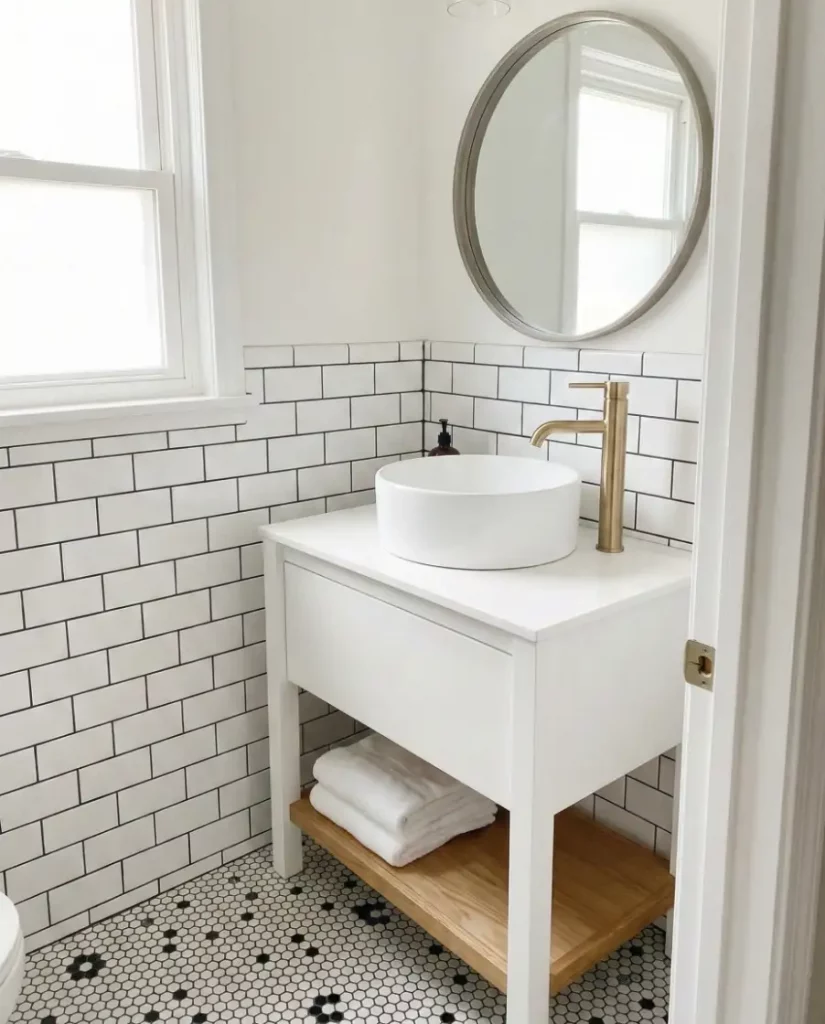 Bold tile patterns bring instant personality using a classic black and white palette. This graphic look works especially well in tiny bathrooms where visual interest replaces square footage. The contrast keeps the space sharp, structured, and undeniably modern.