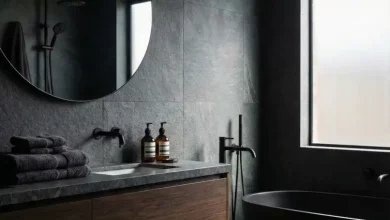 A black bathroom can feel refined without being heavy and with warm lighting and pale stone, it can feel quietly elegant and surprisingly inviting. Textures, layer, and modern avoid harsh edges, which is ideal for the homeowner who likes darker themes with some balance.