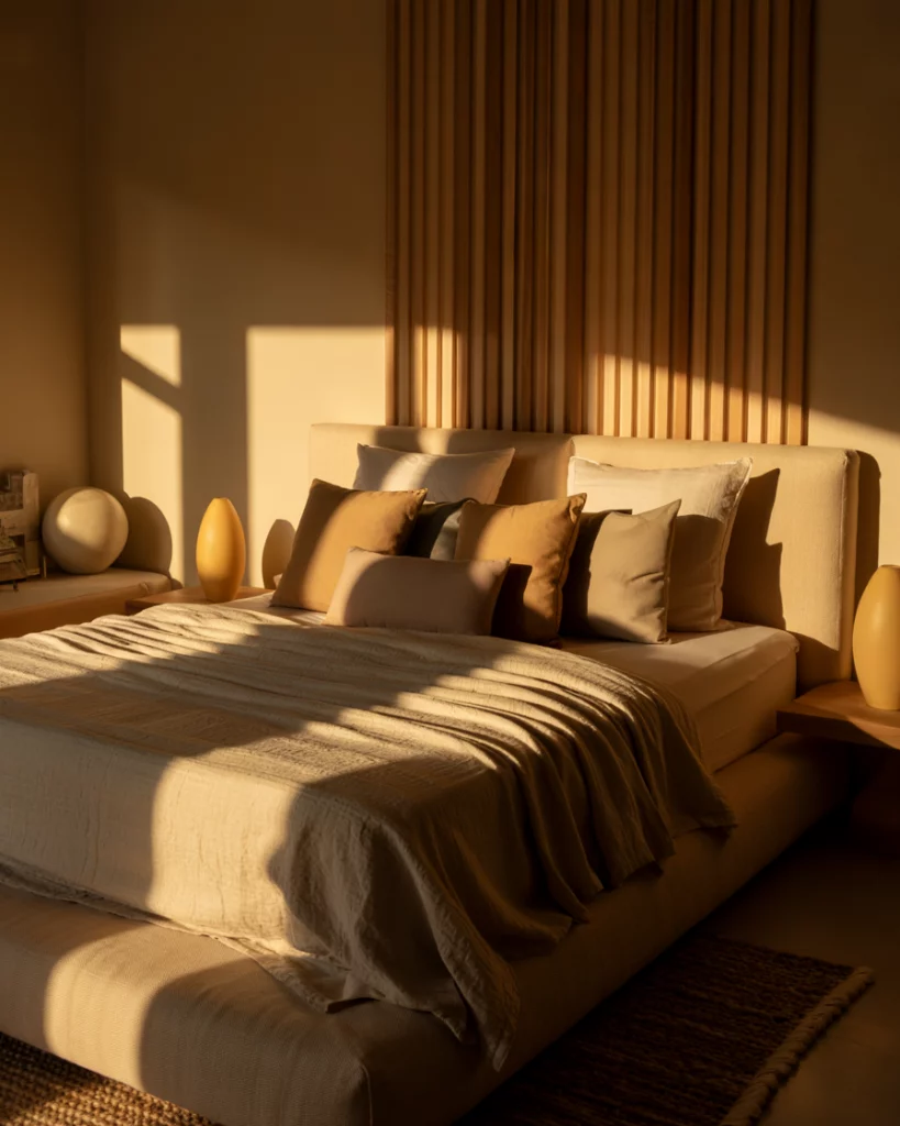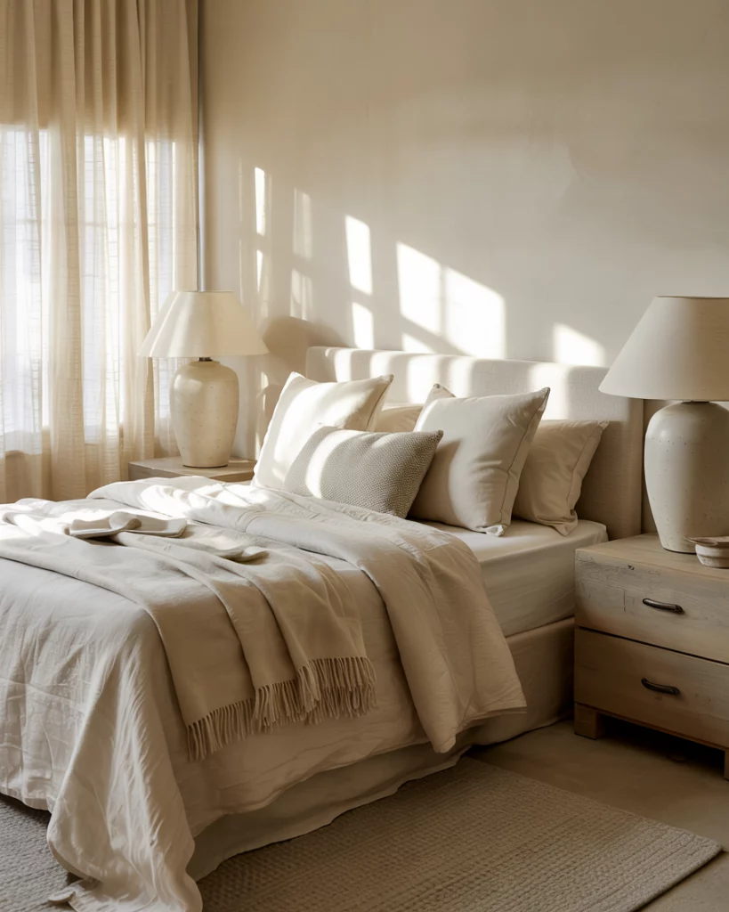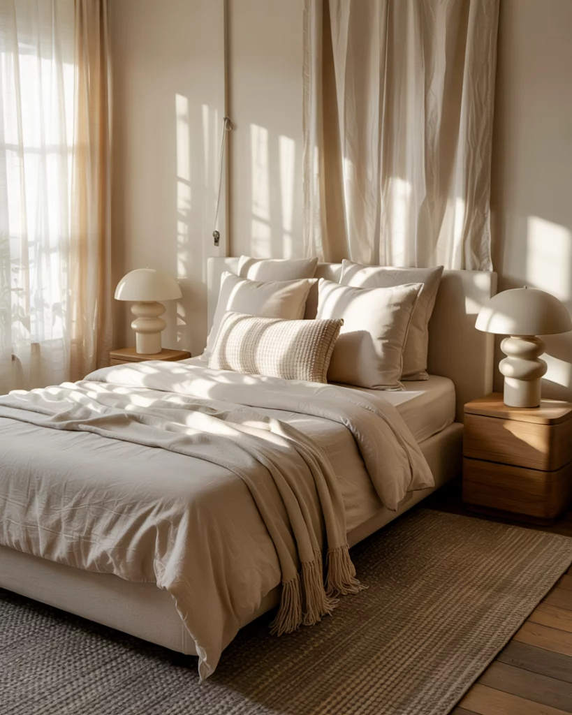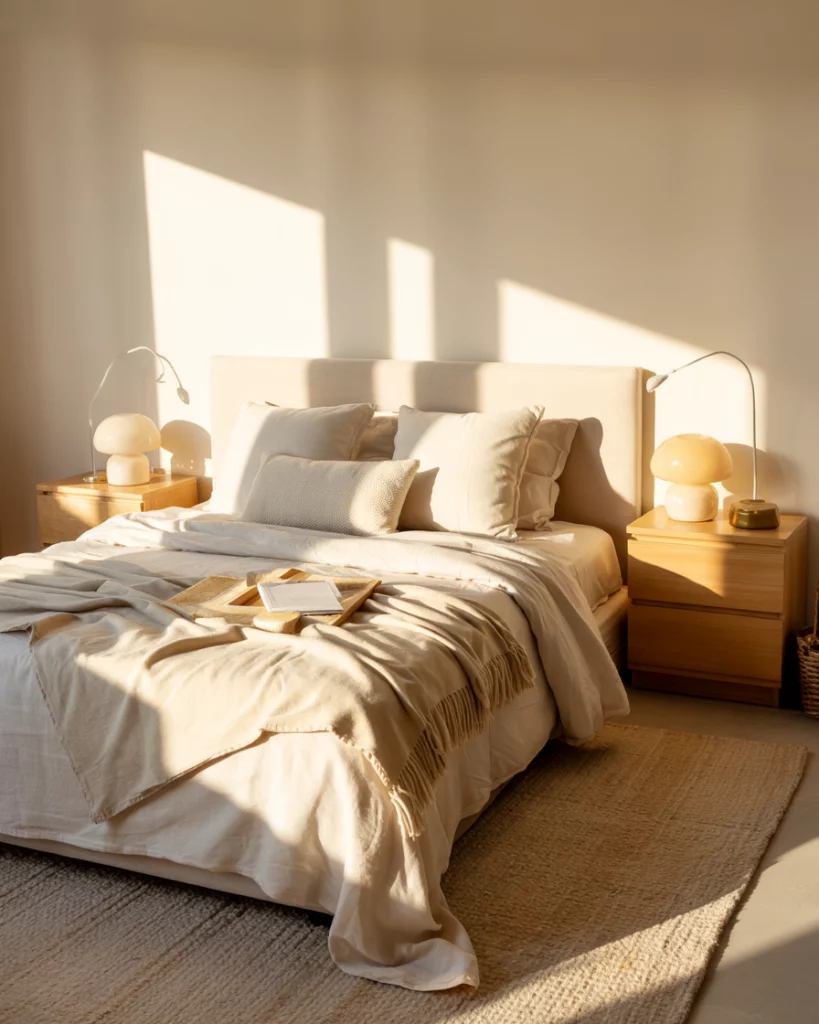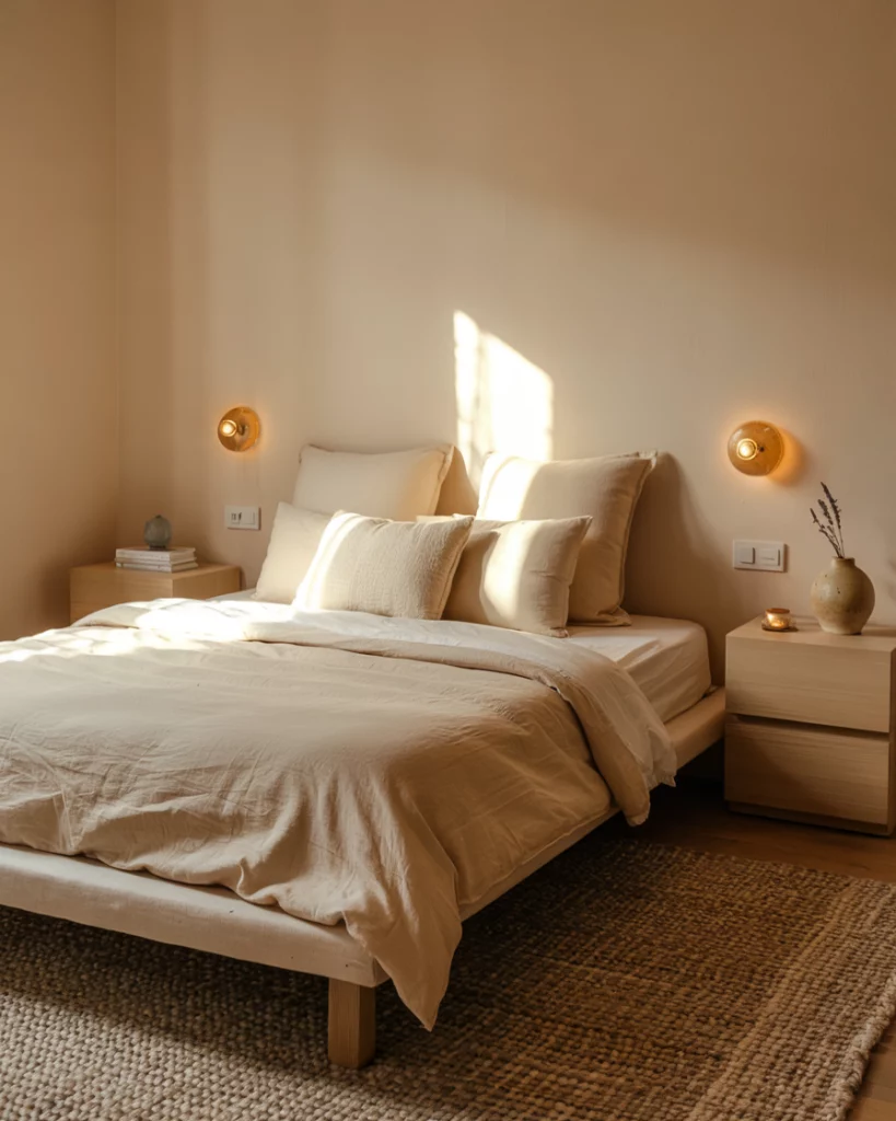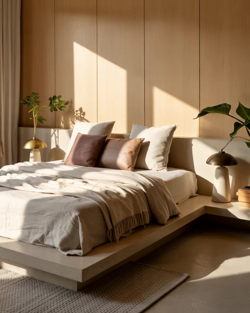A warm minimalist retreat uses texture and tone to create an intimate setting without clutter. Soft bedding, muted lighting, and subtle wood accents keep the space grounded, while touches of neutral layers and hints of relaxing warm tones make the room feel nurturing and calm. This look works especially well for anyone craving serenity after long days. To apply this idea effectively, focus on moderation: too many decorative objects can dilute its impact. A practical insight is to limit décor to items with clear function—lamps, trays, and fabrics—so the room feels pared back yet welcoming.