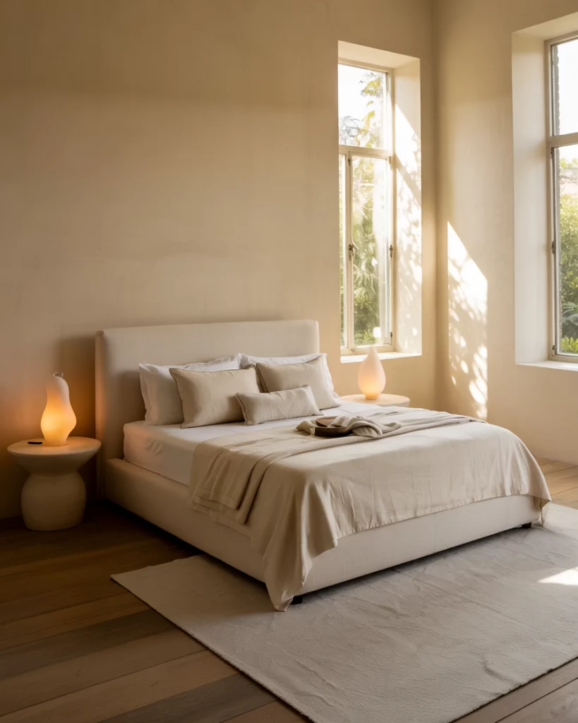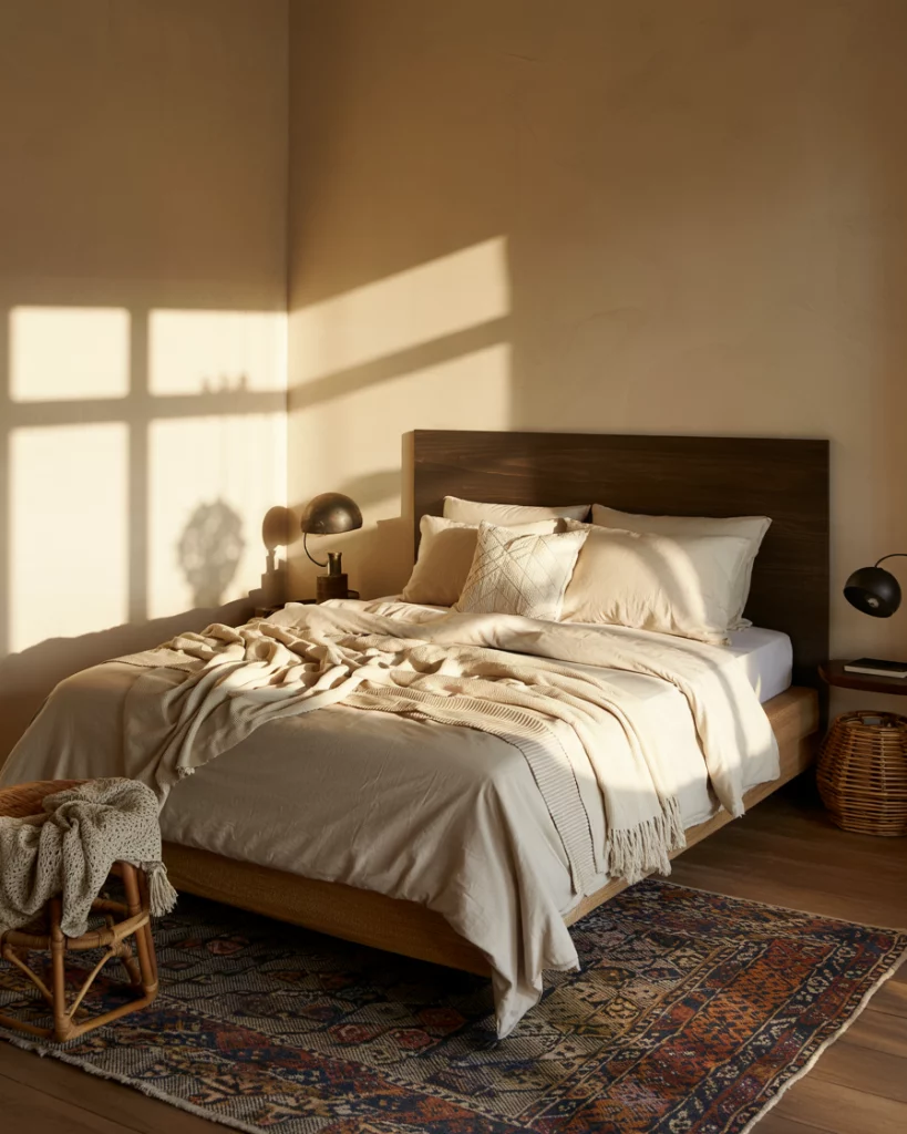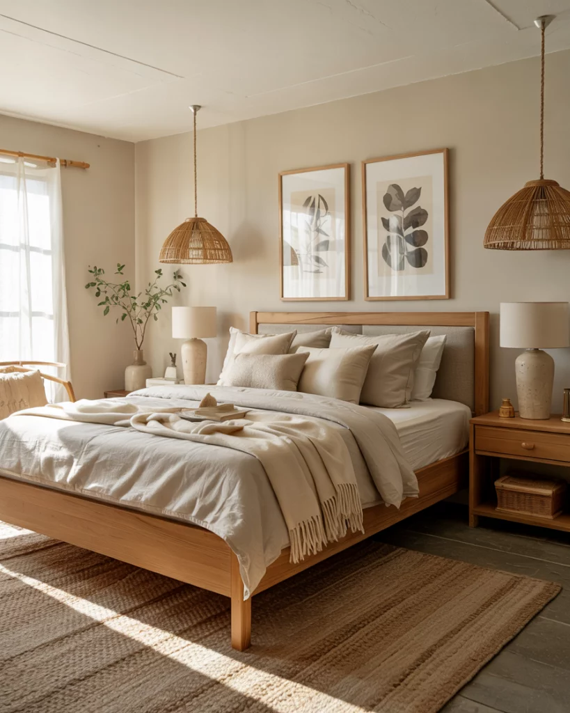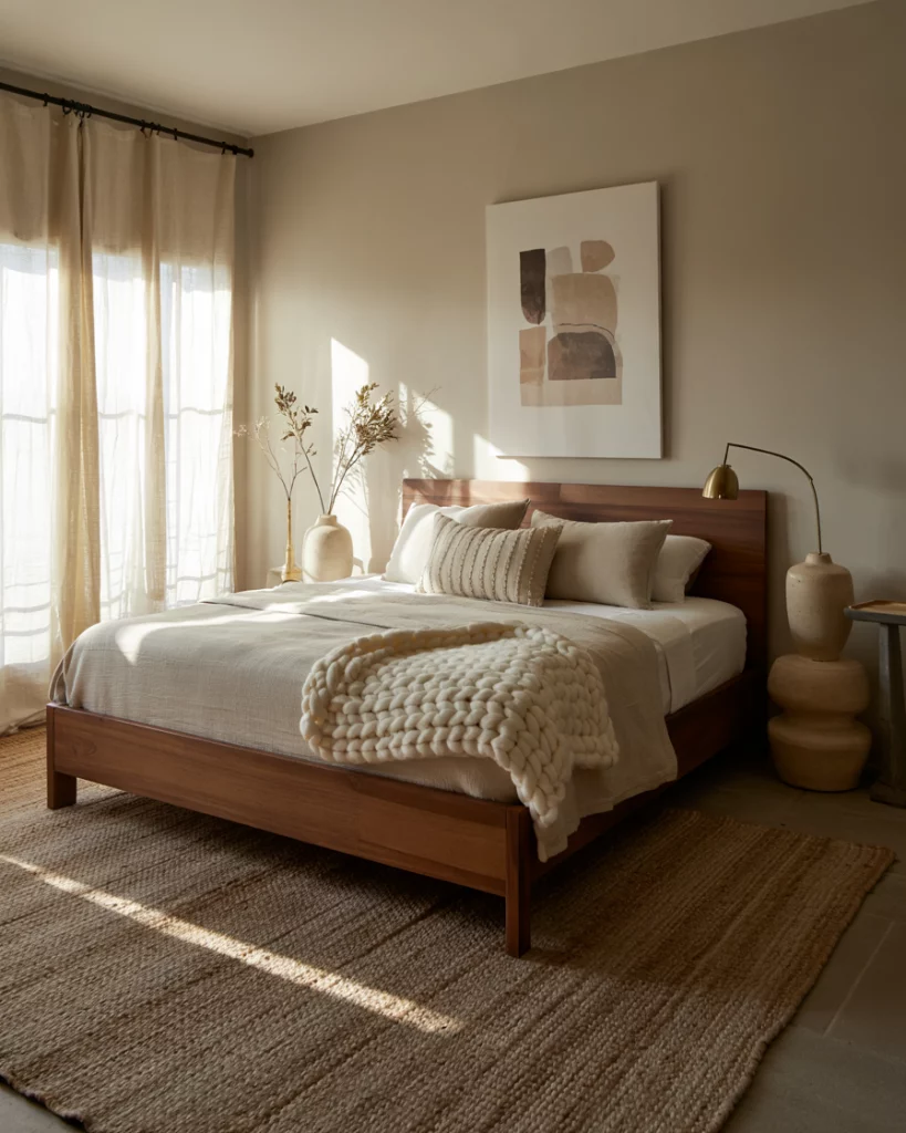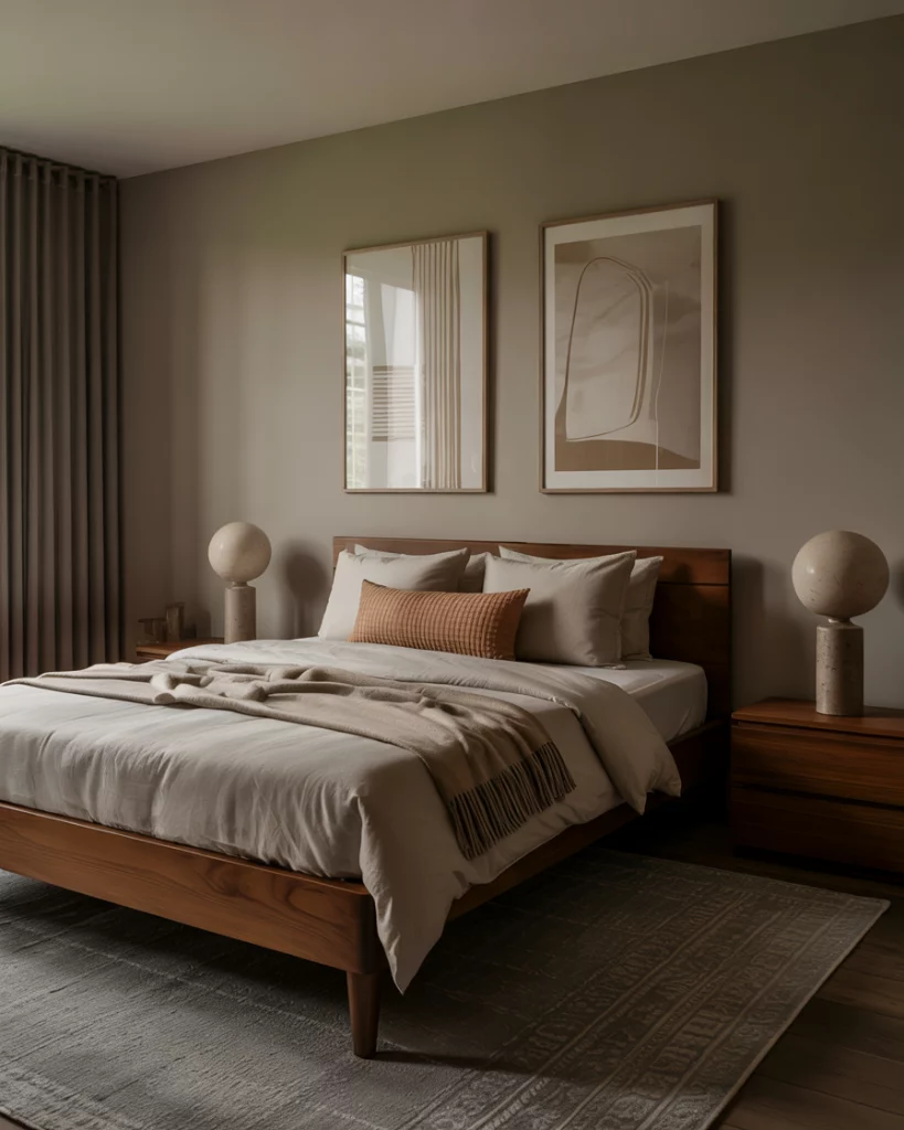 This look combines warm woods, sculptural lighting, and soft textiles for a grounded yet modern bedroom. Subtle earth tones wrapped around clean lines create a calm visual rhythm, complemented by touches of modern detailing and hints of relaxing textures. It suits anyone wanting a peaceful room that still feels contemporary. Where this works best is in rooms with limited architectural detail. The clean shapes and warm tones help define the space without overwhelming it, making even plain, boxy rooms feel intentional and inviting.