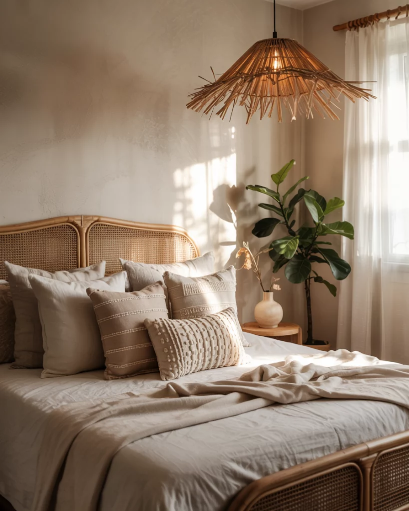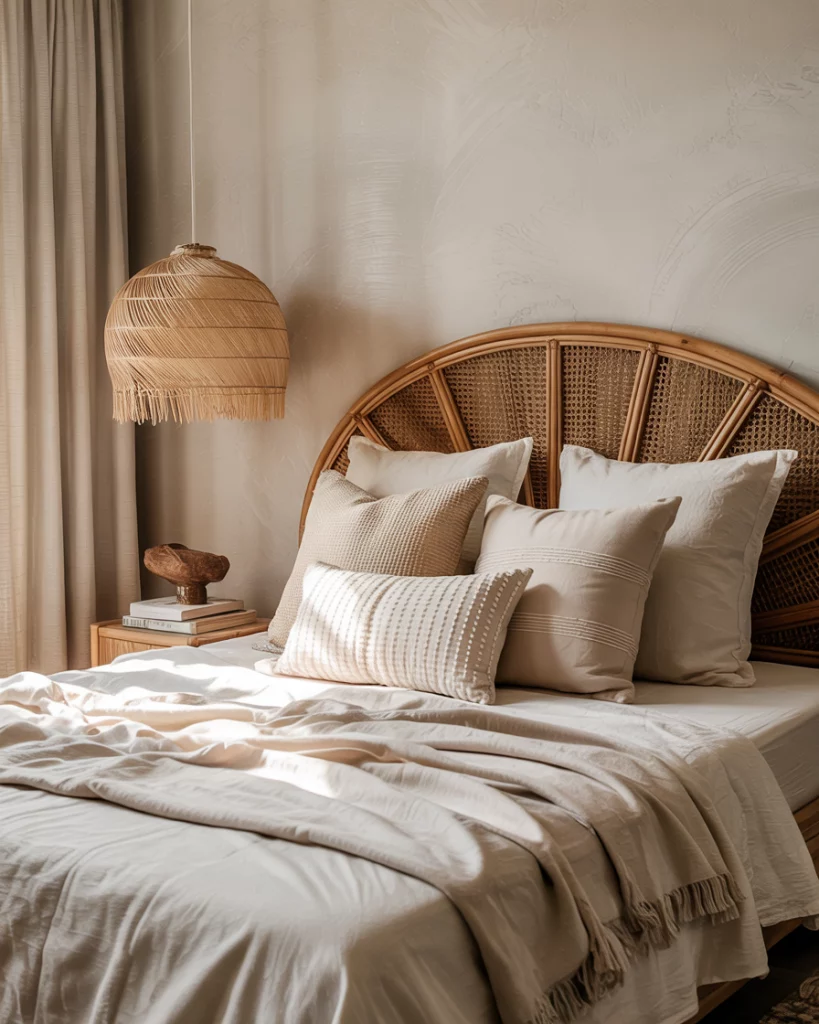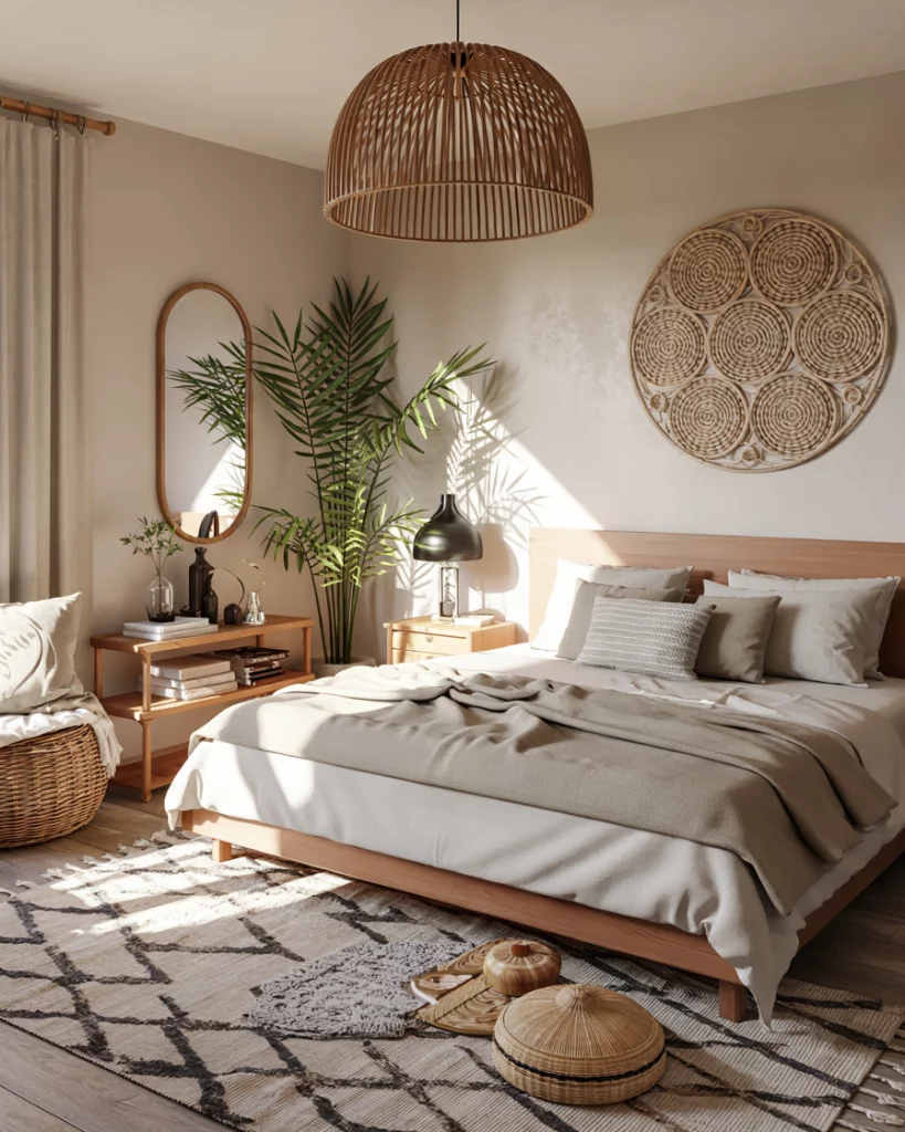 Boho doesn’t have to mean busy. A soft, pared-back version uses creamy neutrals, woven textures, and airy layers for a soothing feel. Elements of relaxing boho and neutral hues create a peaceful environment that still feels expressive and personal, perfect for slow mornings and quiet evenings. A common mistake is relying too heavily on patterned textiles. Limiting busy prints helps keep the room calm rather than chaotic, allowing textures to take the lead in shaping the space.