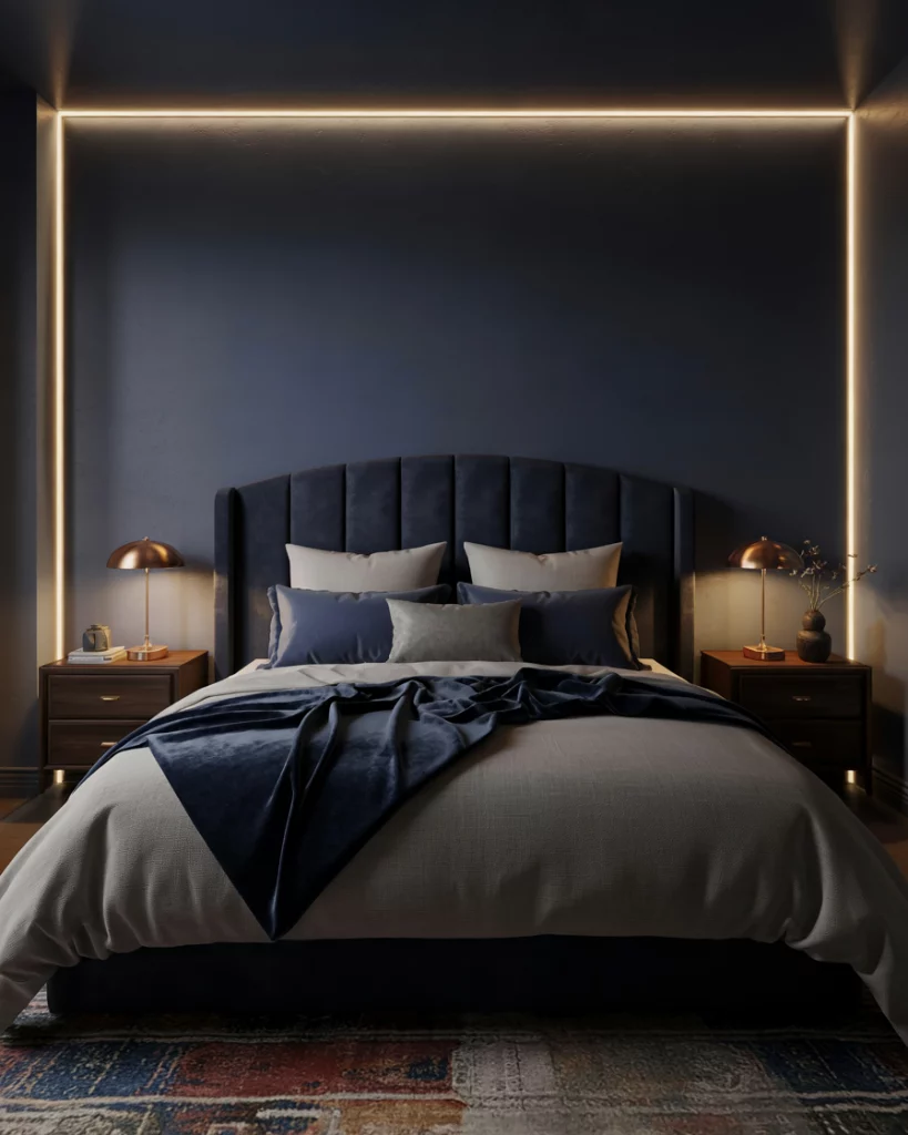 Navy offers an elegant alternative to black, wrapping the bedroom in depth and calm. Layering plush fabrics with soft lighting brings dimension to the space, especially when paired with accents of navy and subtle moody finishes. It’s a palette that feels both classic and modern, depending on the textures you choose. Price-wise, this look can be achieved affordably by focusing on textiles. A good quilt, deep-toned curtains, and a bold headboard wall create the effect without needing luxury furniture pieces.