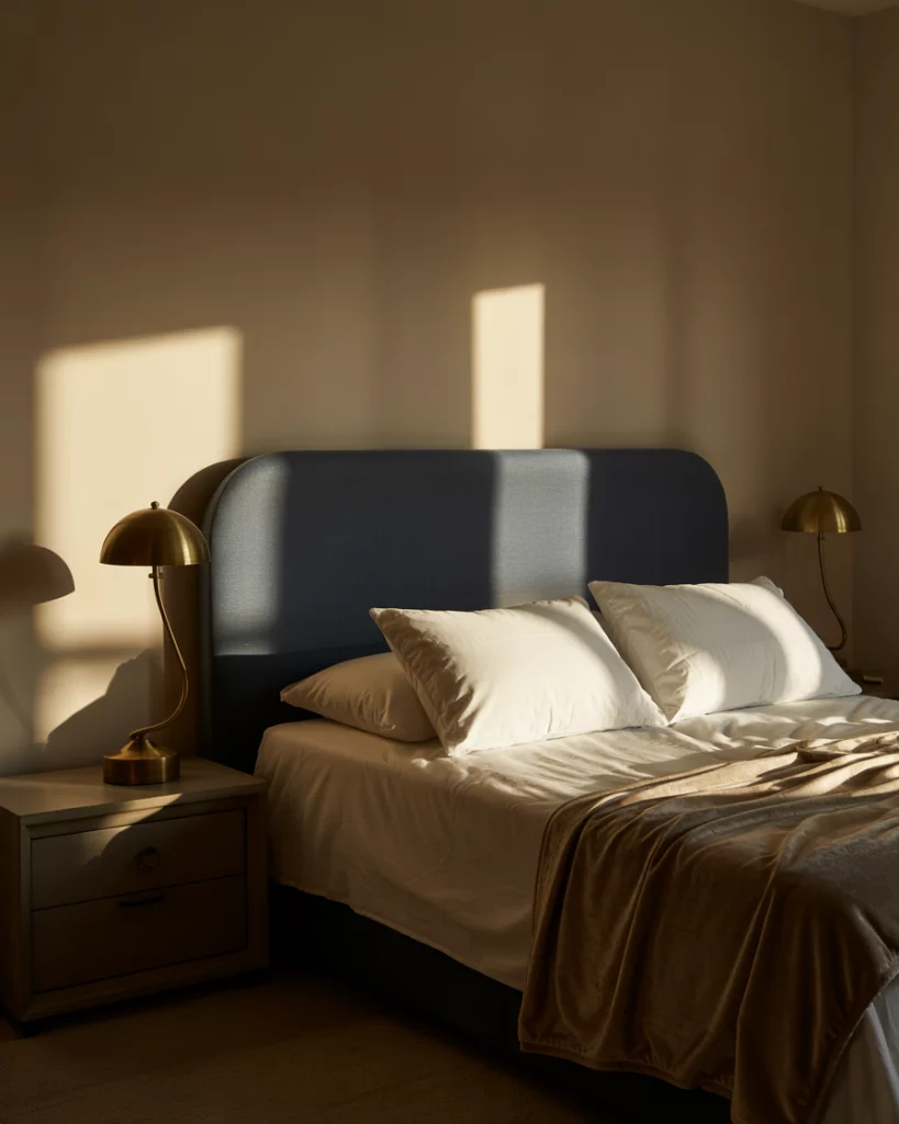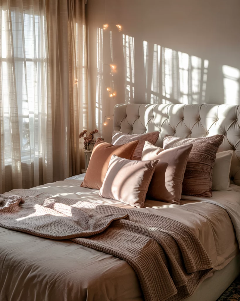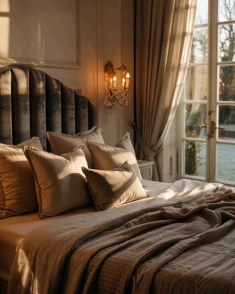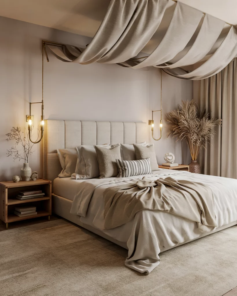 This idea brings romance through fabric, not frills. Think layered linens, warm lighting, and plush headboards. A gentle mix of romantic notes and soft, relaxing warm tones forms a cozy, enveloping bedroom atmosphere. It’s approachable, timeless, and endlessly customizable. A short anecdote: one couple shared that after switching to layered fabrics, their room felt “instantly softer,” turning their nightly routine into something closer to a quiet ritual.
