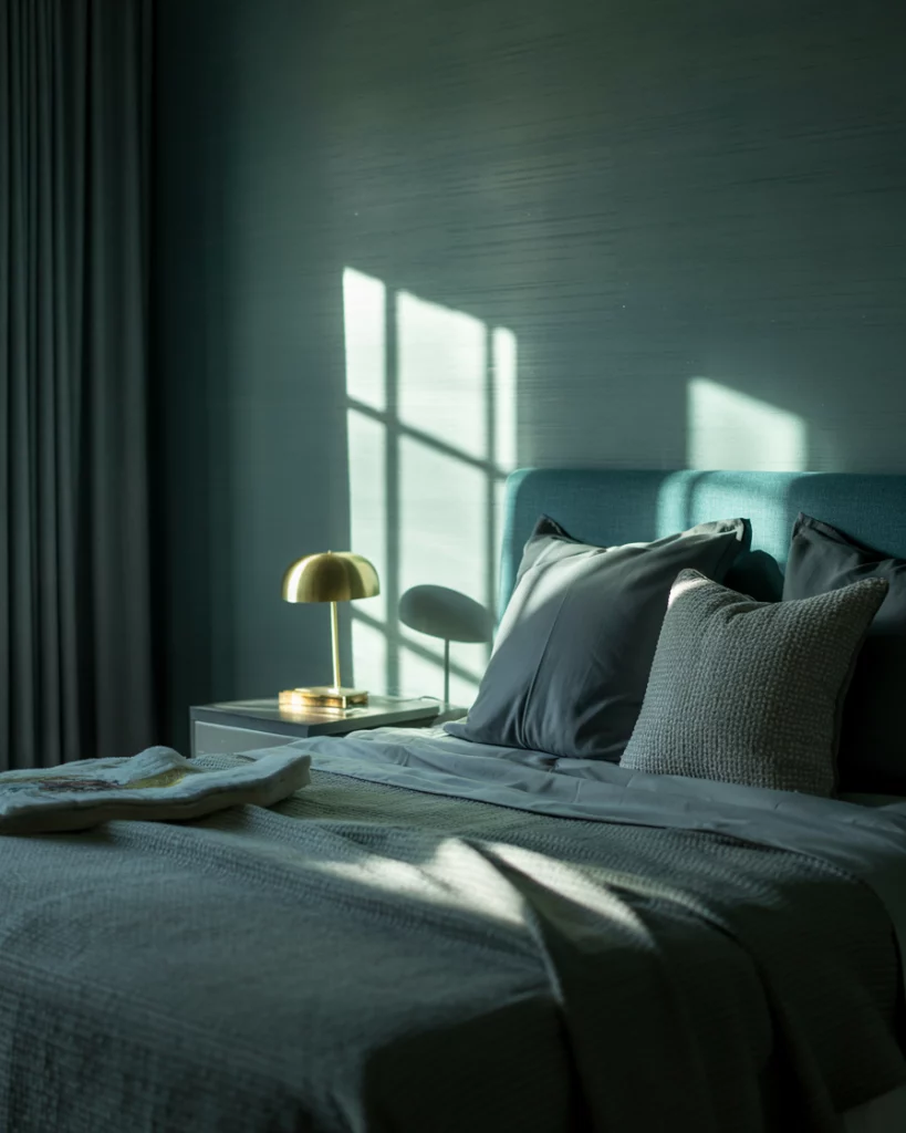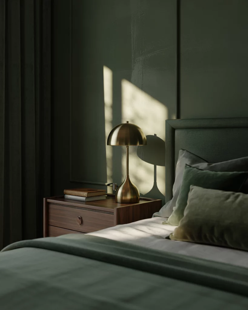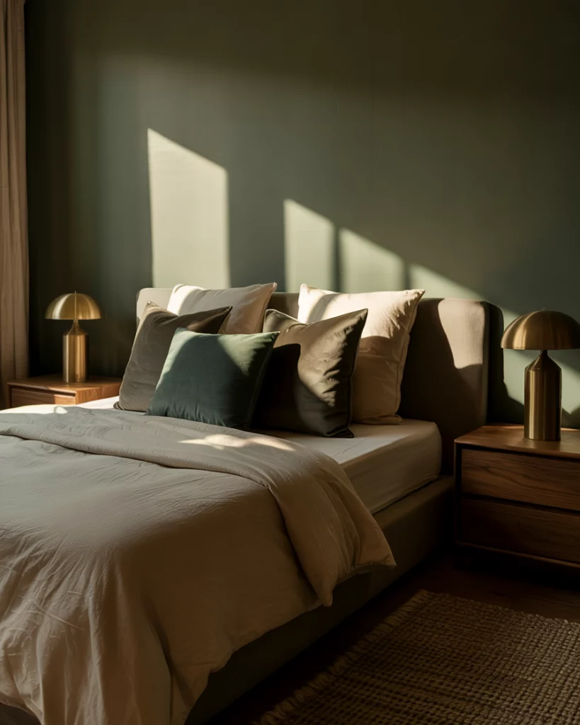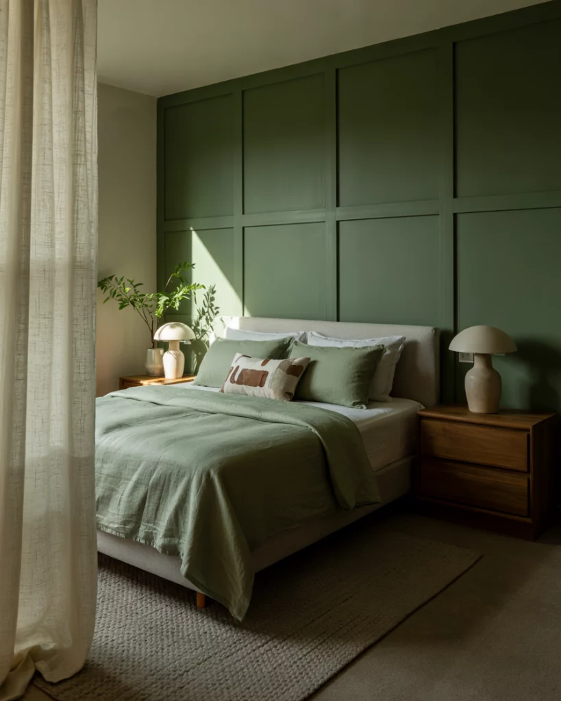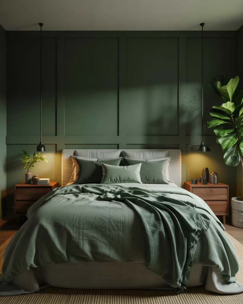 Rich green tones bring a luxurious calm to the bedroom, especially when paired with matte textures and refined finishes. Deep dark green walls or bedding combined with touches of luxury accents elevate the space into a tranquil retreat. It’s a bold but surprisingly soothing approach. Experts often recommend using low-sheen finishes for dark greens. Glossy paint can reflect light unpredictably, while matte texture creates a softer, more restful atmosphere.