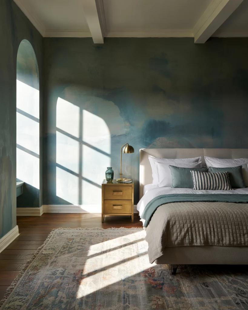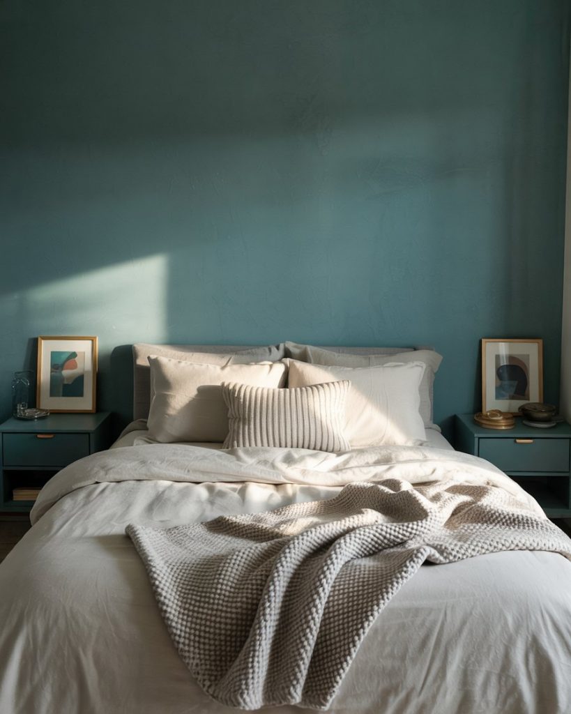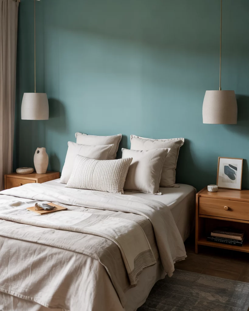 Combining blue and green creates a layered, atmospheric palette perfect for a restful master bedroom. Muted blue shades alongside deep color scheme accents build richness without overwhelming the space. This look feels both artistic and deeply calming. Where this works best is in bedrooms with moderate natural light. Too much sunlight can wash out deep tones, but a balanced amount enhances their richness beautifully.