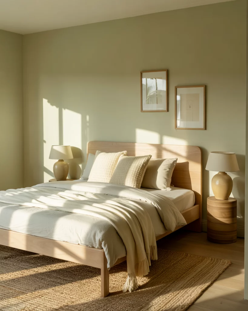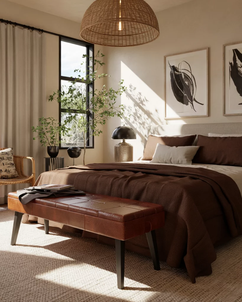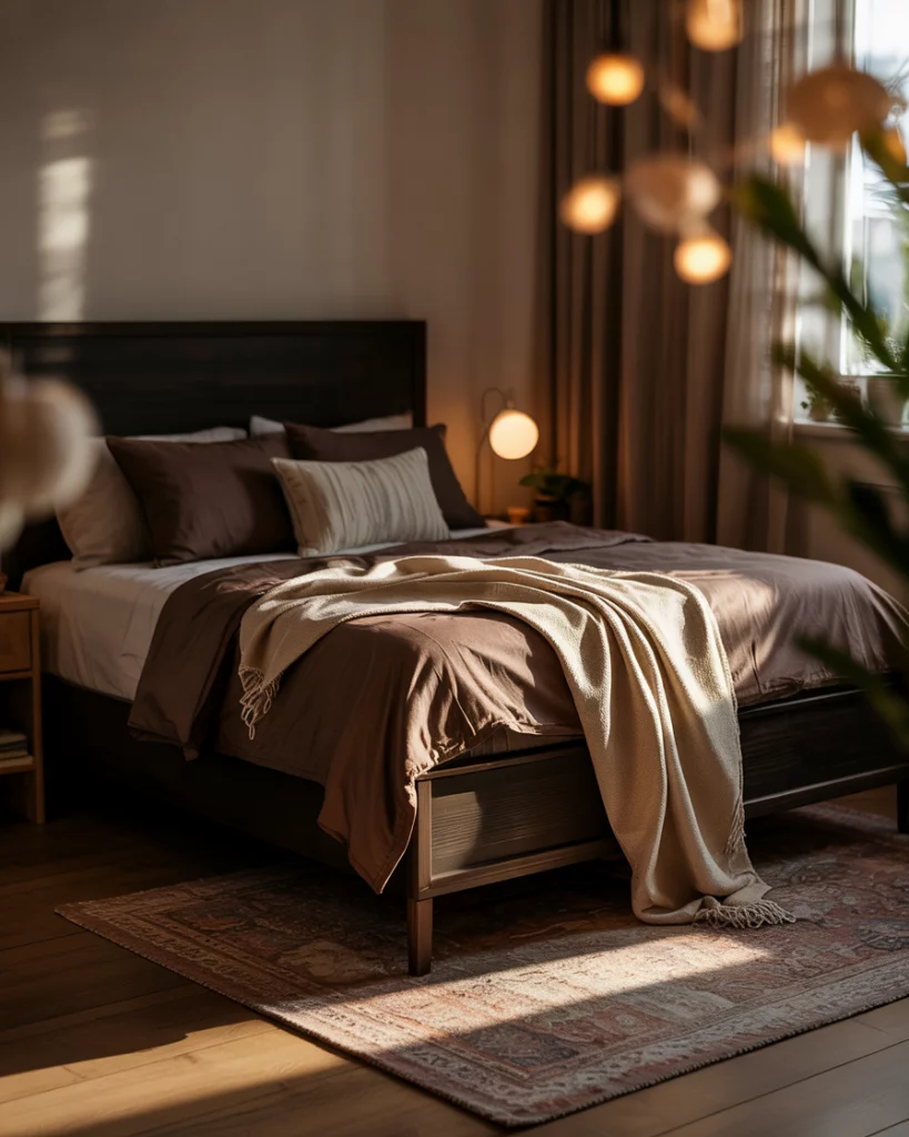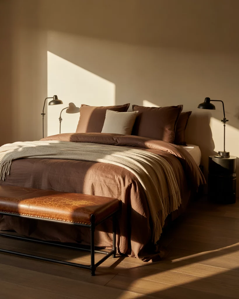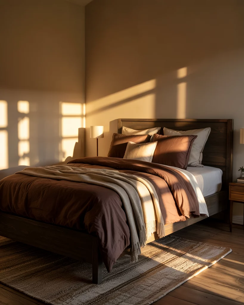 Deep, earthy hues create an enveloping bedroom atmosphere that feels grounded and timeless. Rich wood tones paired with layered bedding offer warmth, while subtle hints of brown and cozy, relaxing textures make the space feel restorative. It’s perfect for anyone drawn to natural colors and tactile comfort. From a regional perspective, this look resonates in colder climates across the U.S., where deeper tones help bedrooms feel warmer during long winter months.