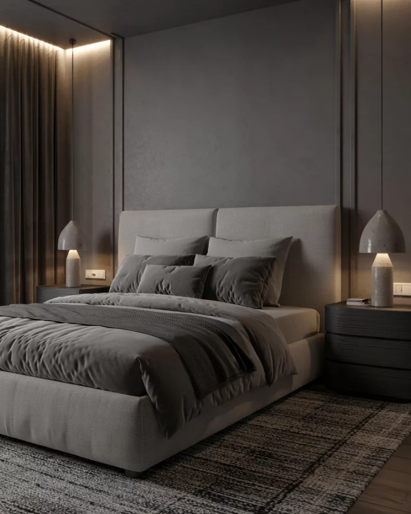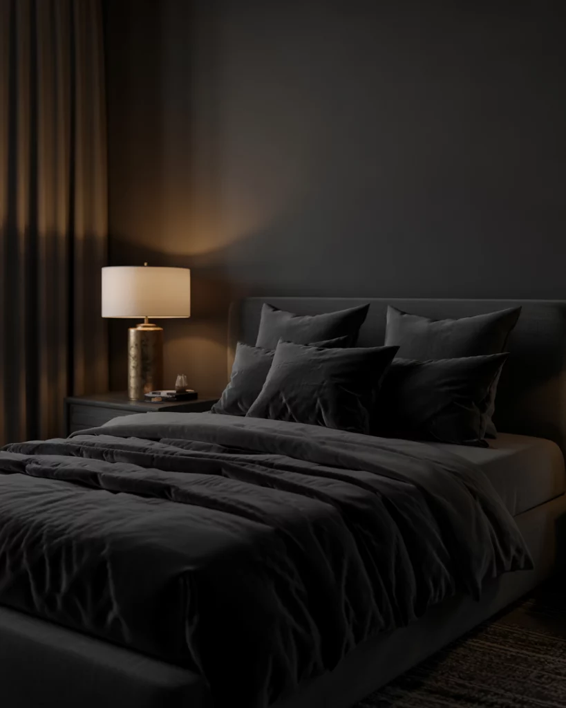 A moodier palette can transform a master bedroom into a cocoon-like escape. Deep charcoal walls paired with plush bedding create an immersive effect, while accents of dark tones and strategic moody lighting give the space an intimate, sophisticated vibe. This approach works beautifully in larger rooms that can carry bolder color drama. Across many U.S. cities, darker bedrooms have become a staple for those seeking a more hotel-like retreat at home. This American lifestyle trend reflects a growing desire for restful, media-free zones that encourage deeper sleep and unplugged evenings.