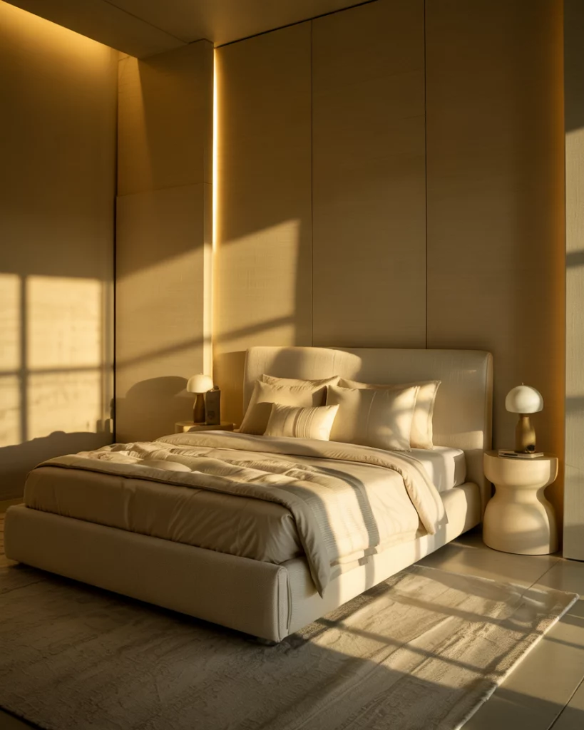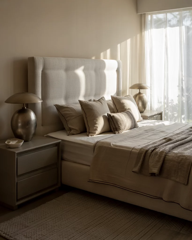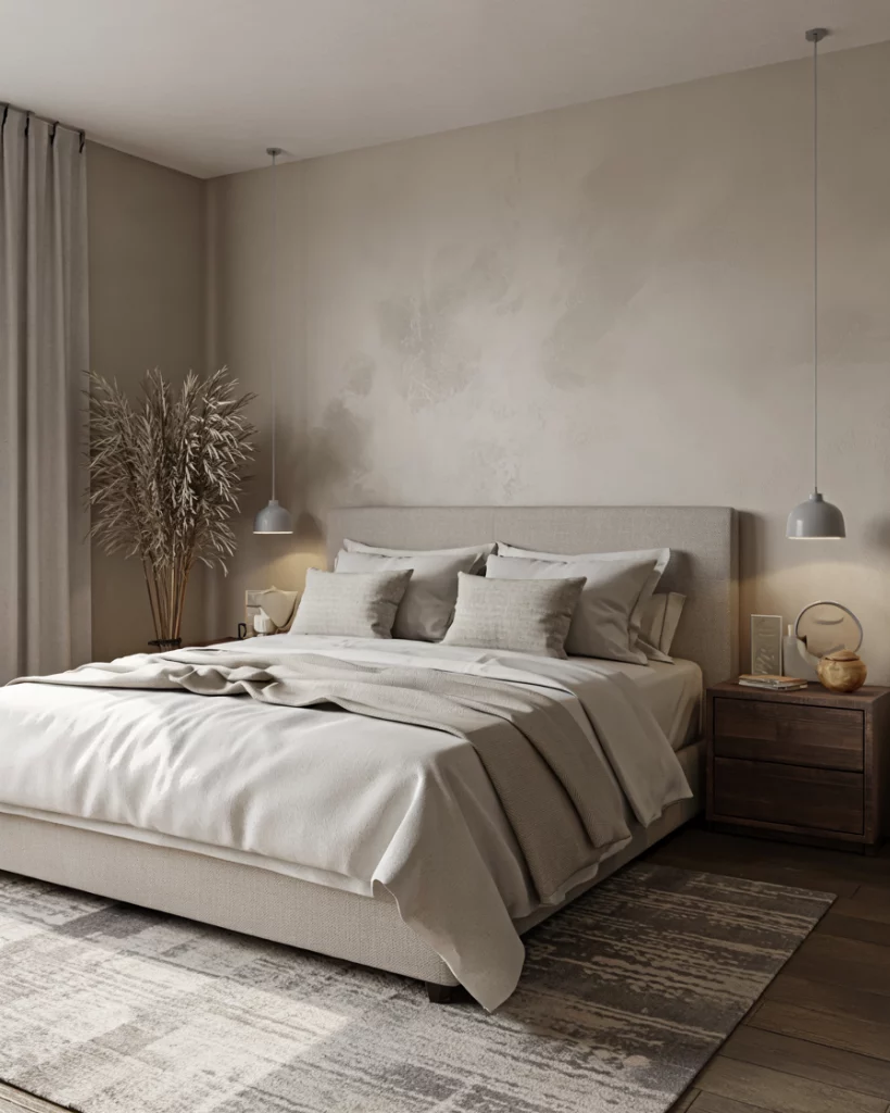 In spacious rooms, neutral luxury is all about proportion and harmony. Subtle taupes, layered creams, and thoughtful lighting give the room quiet grandeur, supported by large-scale furnishings and a luxury-leaning palette that feels both modern and timeless. This style celebrates comfort without unnecessary ornamentation. For homeowners in wide-open suburban homes, this style aligns well with typical American architecture, where generous square footage allows for statement pieces like large headboards and oversized rugs.