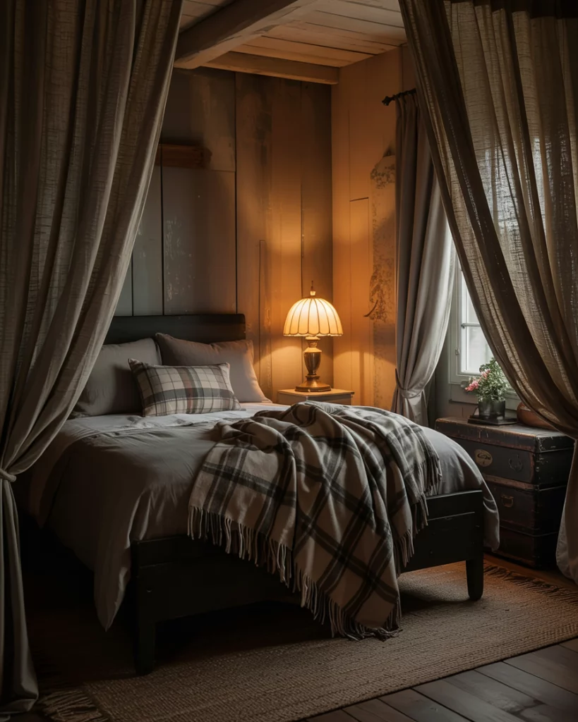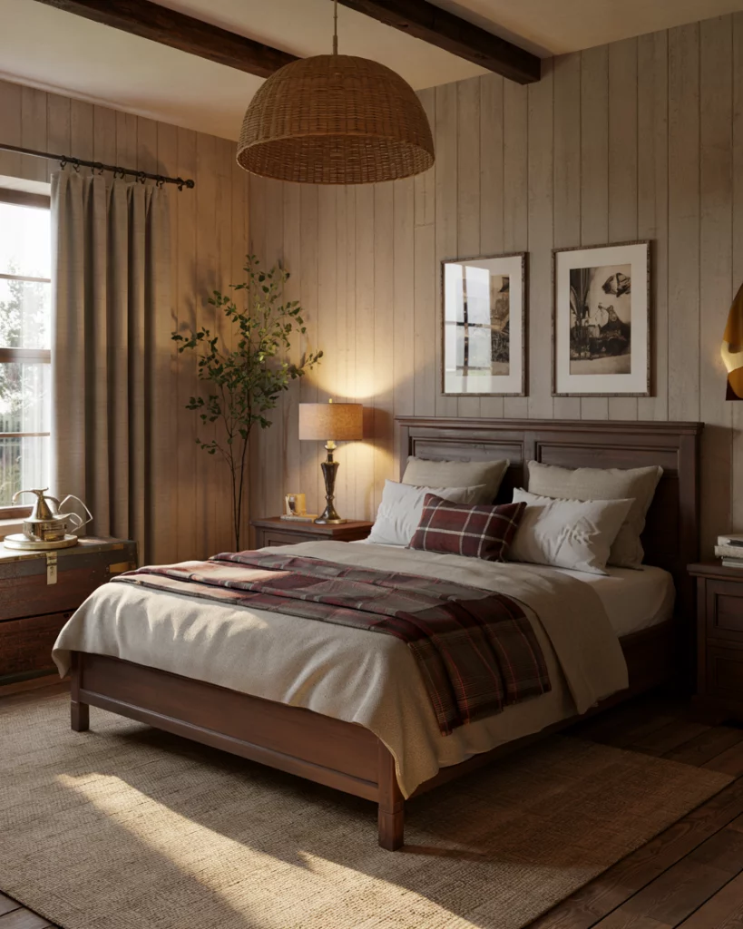 Darker, dramatic rustic styles take on cottage details. Imagine a warm wooden wrap-around, aged rustic pieces, and cottage-style fabric finishes. Cozy, characterful shelters and warm, calm, nostalgic, and soothing design are popular modern master bedroom ideas for 2026.