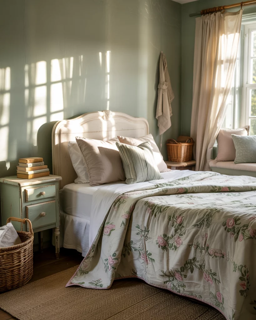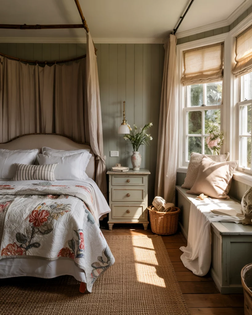 For those who love charm and comfort, a cottage-inspired bedroom blends floral textures, painted furniture, and warm textiles. Shades of sage and soft cottage-style pieces bring instant familiarity, creating an inviting room that feels both personal and timeless. It’s a gentle mood that suits homes from small bungalows to country retreats. When planning this style, think about where it works best: spaces with good natural light and simple architecture. Even modern builds can benefit from cottage touches, but rooms with window nooks or angled ceilings shine brightest with this approach.