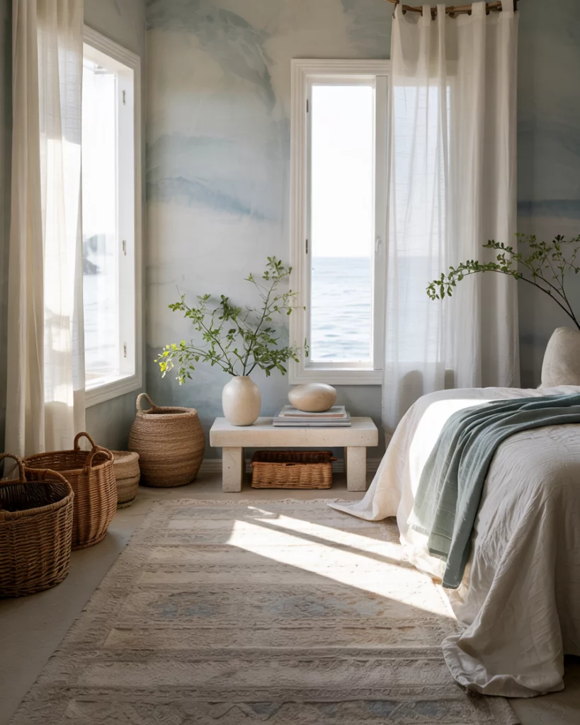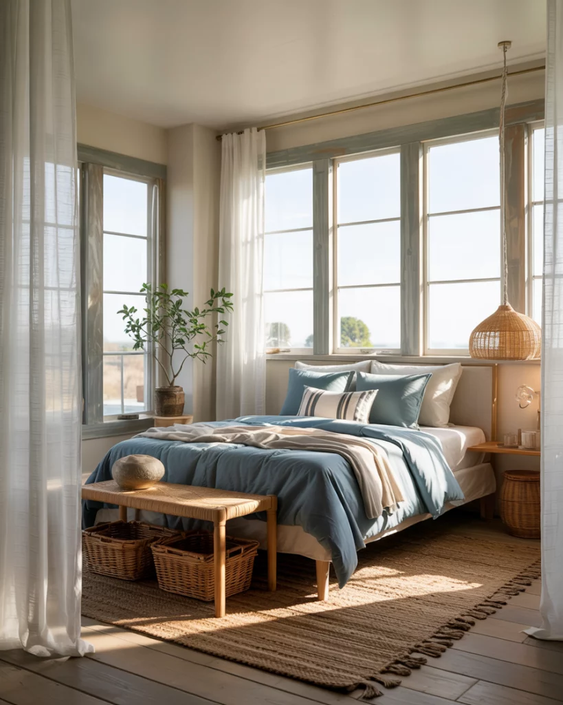 If you love breezy, ocean-inspired spaces, a coastal blue bedroom offers calm without clichés. Layered textures, airy curtains, and touches of blue paired with muted color accents create a relaxed ambience reminiscent of beach mornings. This palette feels especially soothing during transitional seasons when light shifts throughout the day. Budget-minded homeowners can recreate this look for less by focusing on textiles rather than furniture. Simple bedding swaps, curtain changes, and a well-chosen rug can shift the entire atmosphere without major expense.