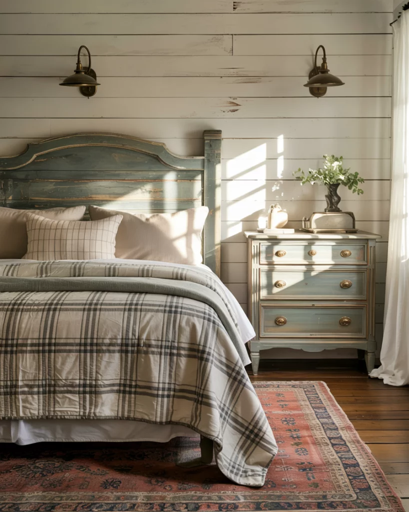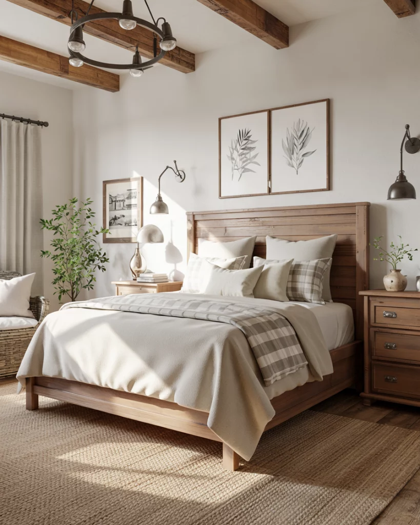 A modern farmhouse bedroom balances rustic charm with updated silhouettes. Think weathered woods, iron accents, and layered quilts softened by farmhouse textures and warm brown tones. This style suits families and anyone wanting a cozy room that still looks curated and intentional. Real homeowners often lean on layered textiles to soften rustic elements. Many find that mixing new pieces with heirloom furniture keeps the look authentic without feeling overly thematic or staged.