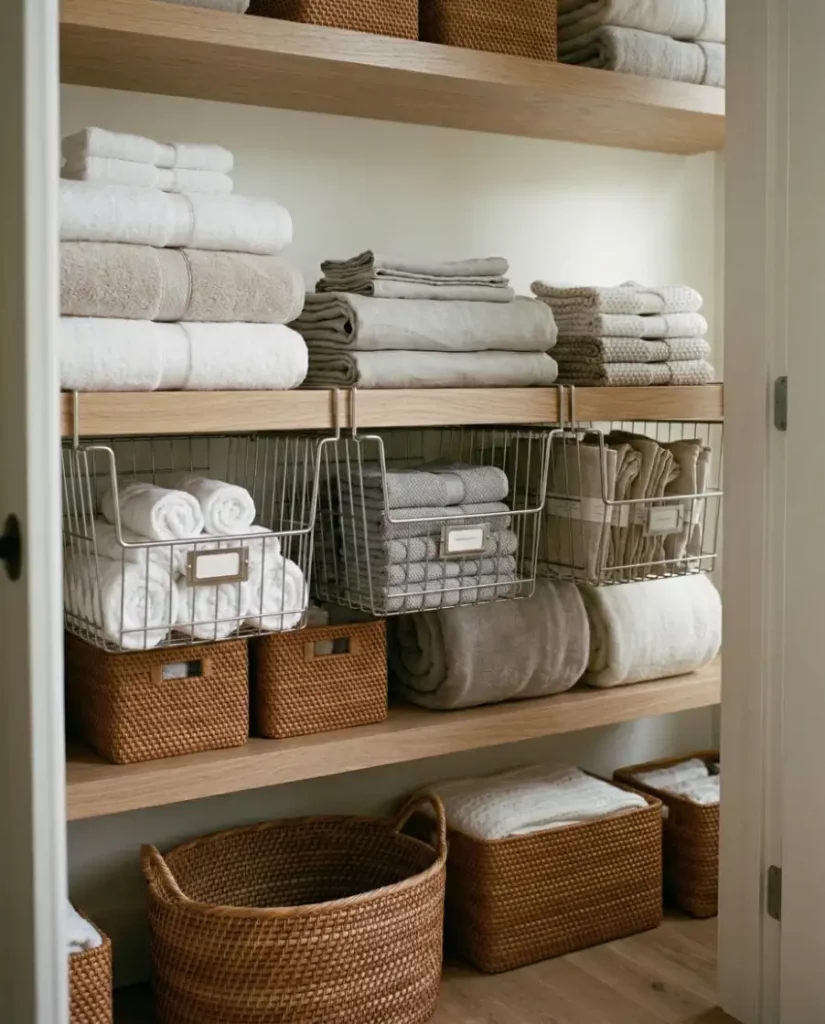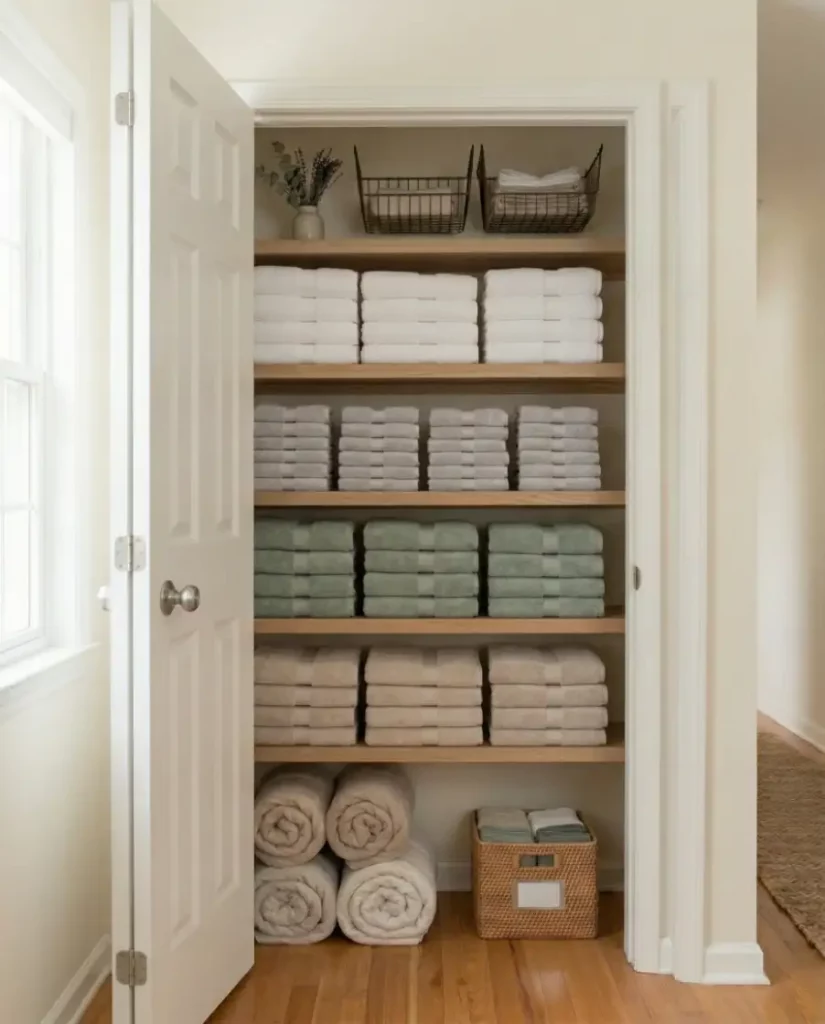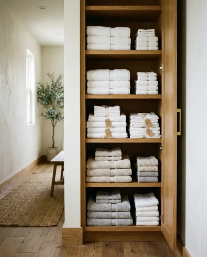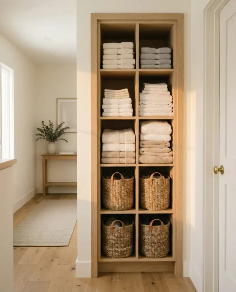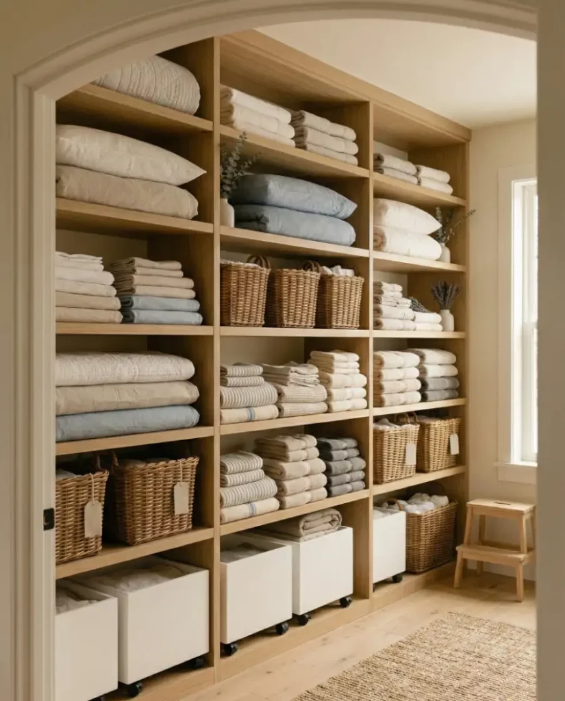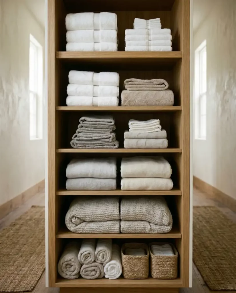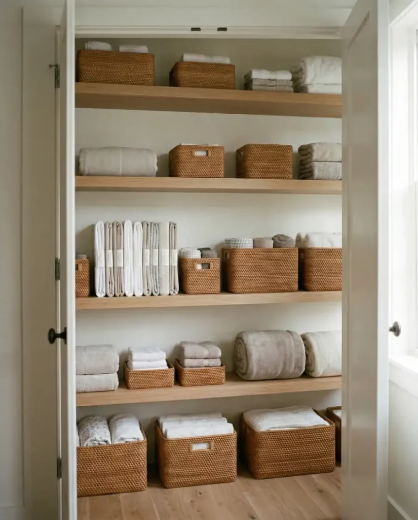 For homes leaning toward a minimalist aesthetic, open shelving can transform a linen closet into a design feature rather than hidden storage. Soft stacks of towels, neutral baskets, and folded linens create an airy display that works well in shared spaces. When styled thoughtfully, open shelving keeps essentials visible and easy to reach.