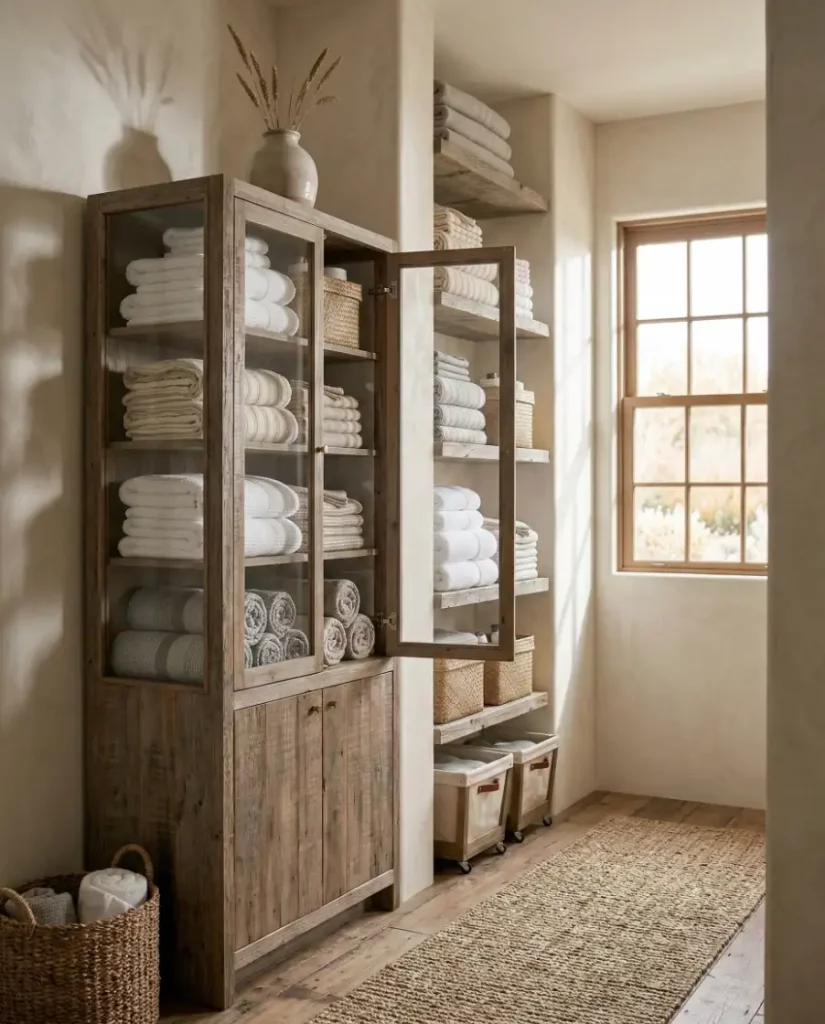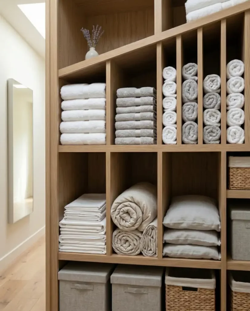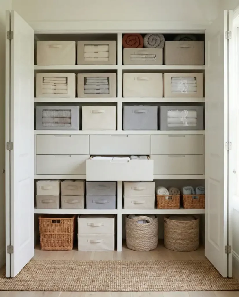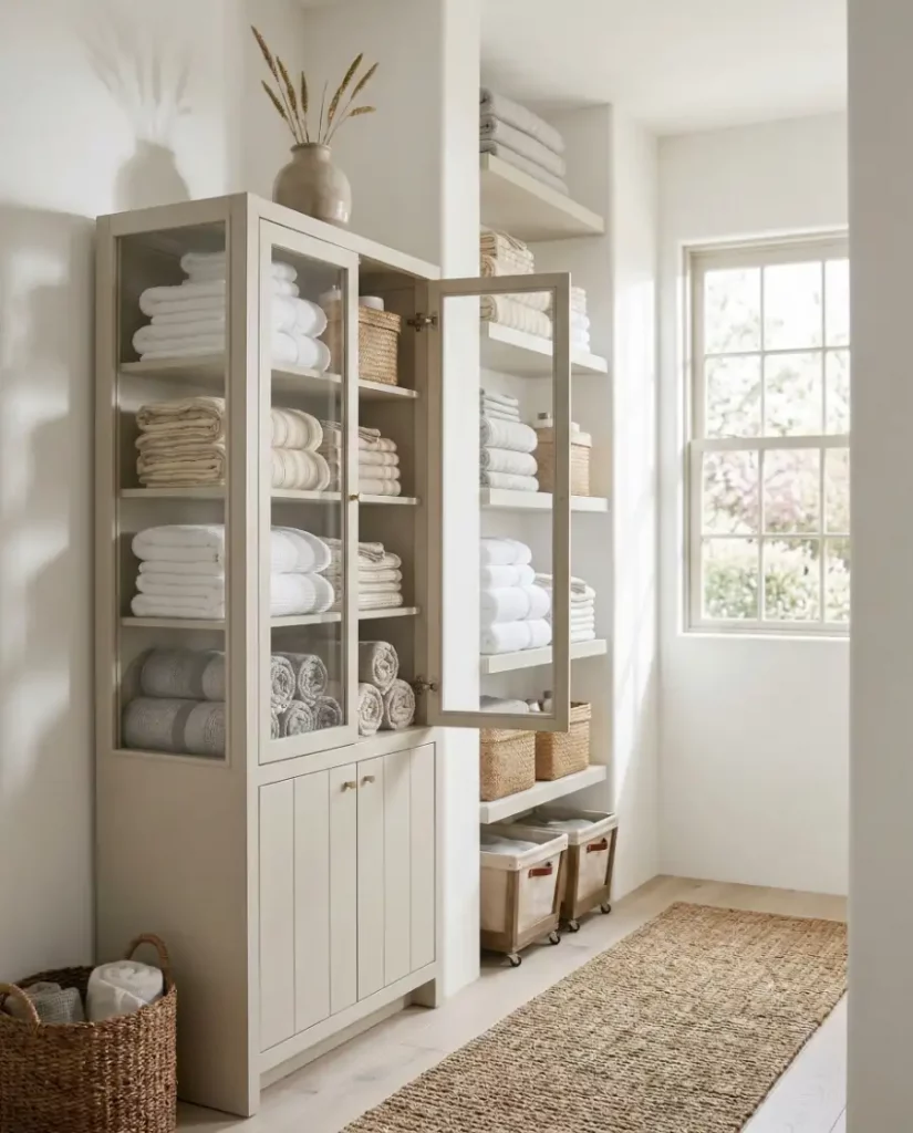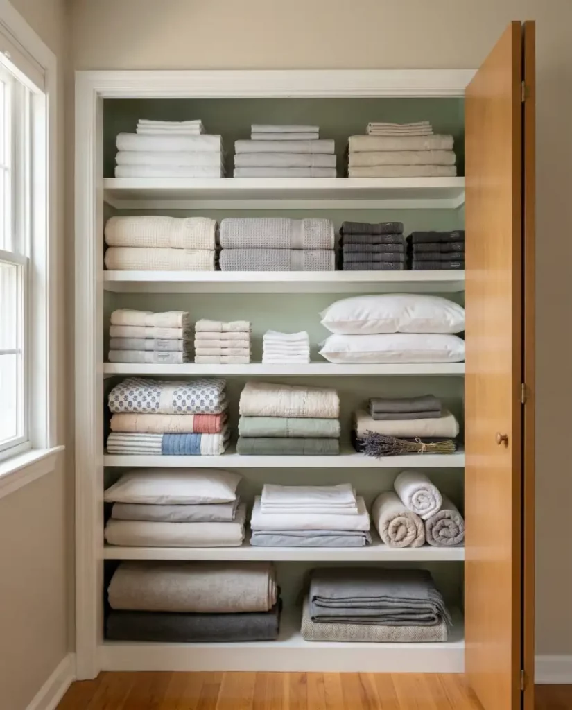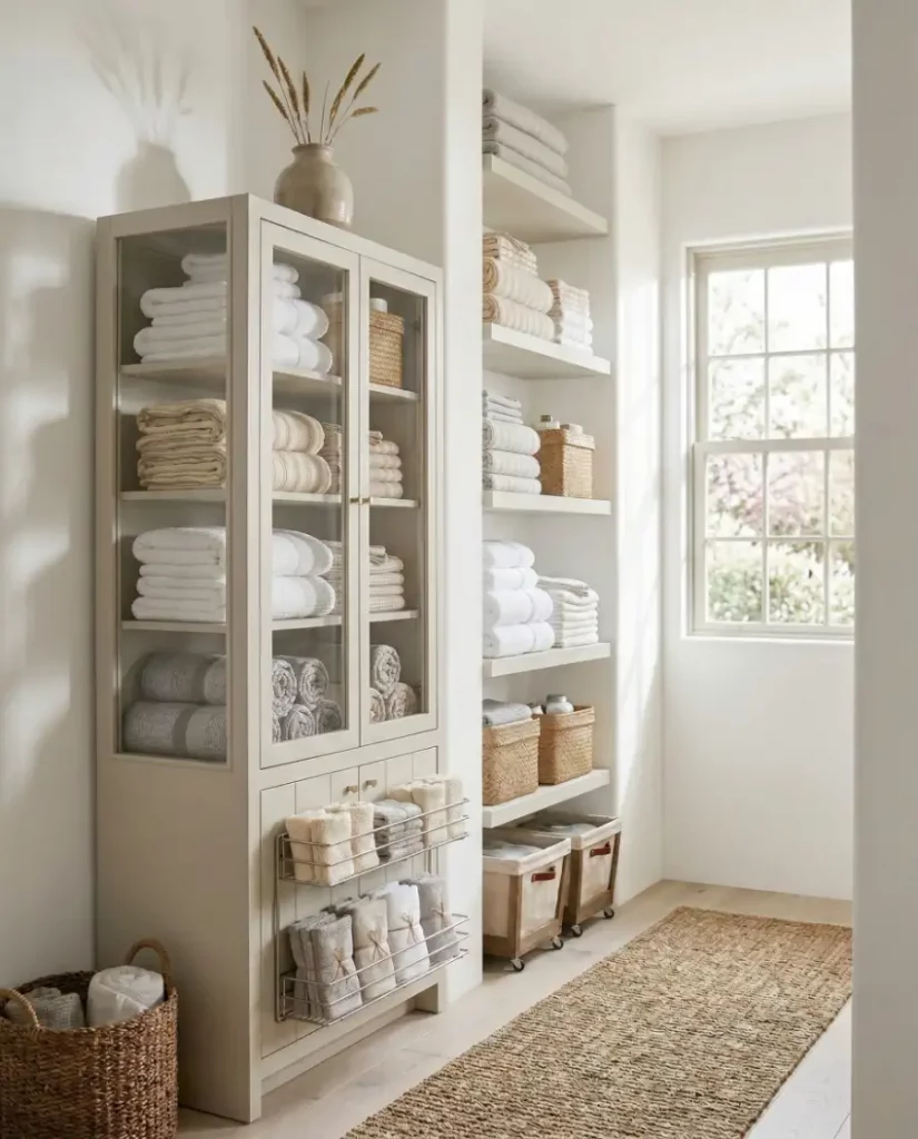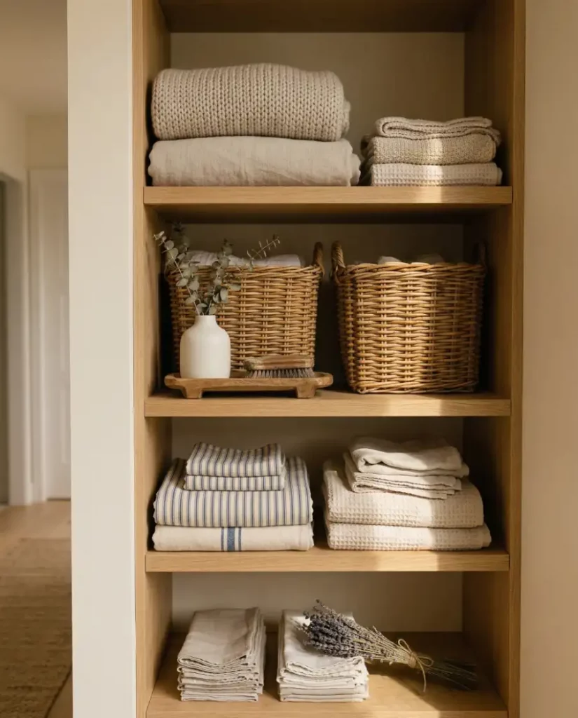 For homes leaning toward a minimalist aesthetic, open shelving can transform a linen closet into a design feature rather than hidden storage. Soft stacks of towels, neutral baskets, and folded linens create an airy display that works well in shared spaces. When styled thoughtfully, open shelving keeps essentials visible and easy to reach.