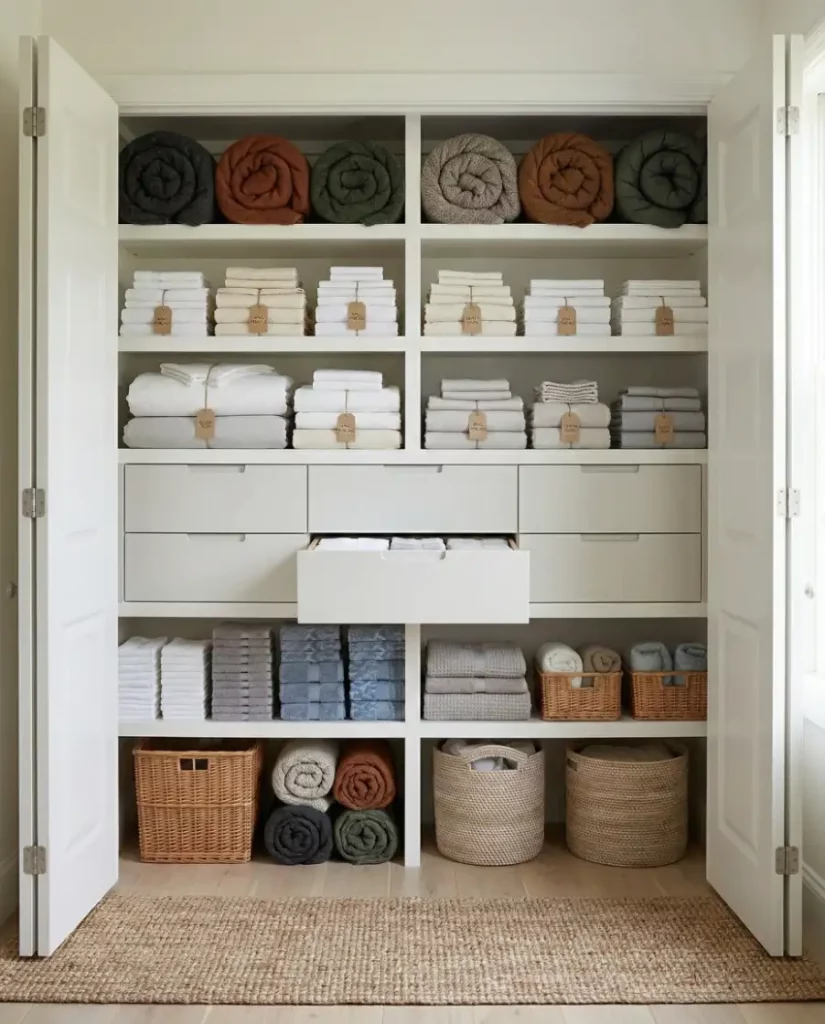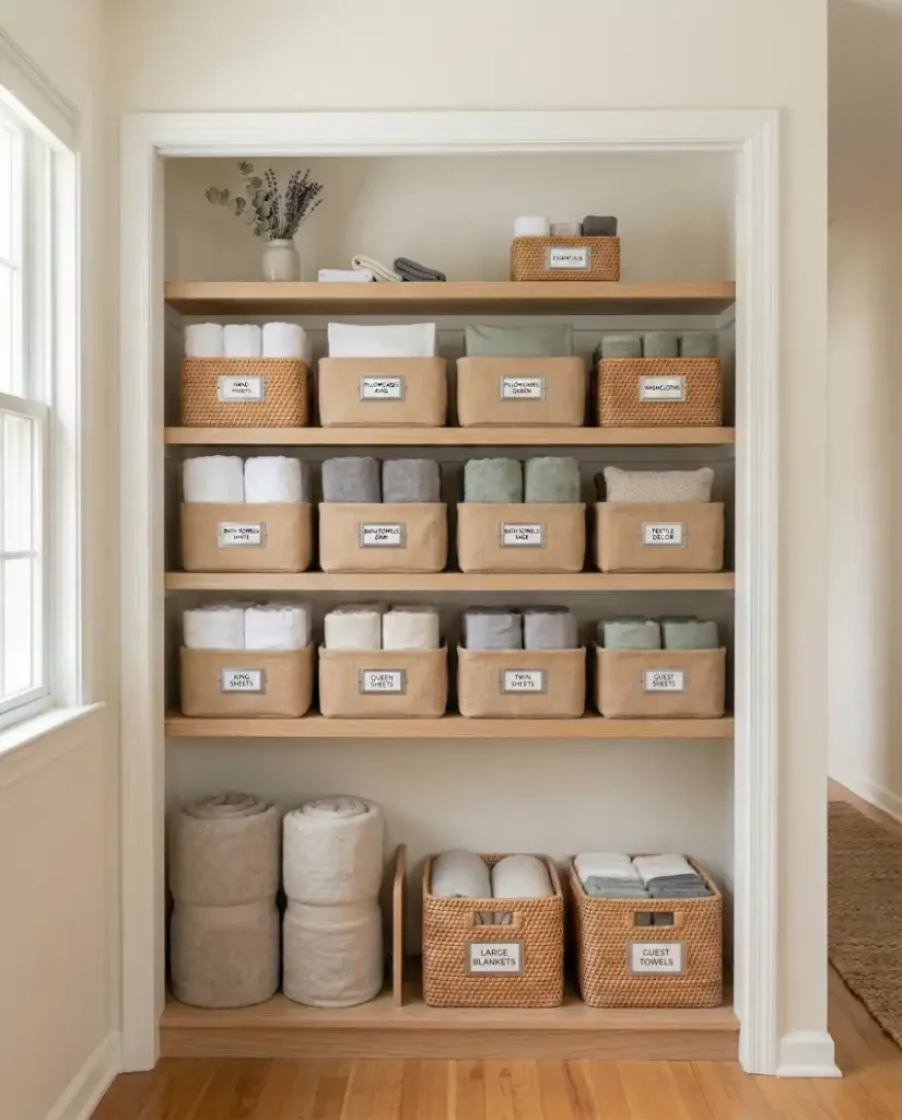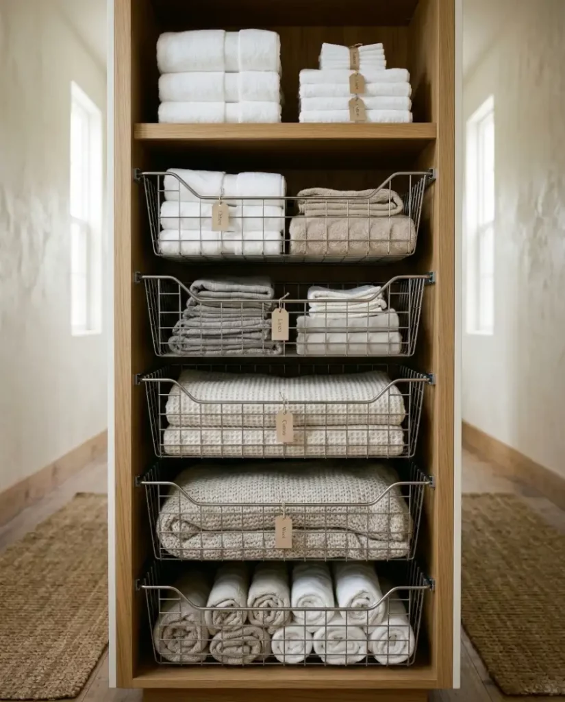 A surprisingly effective system is assigning one basket per bedroom or bathroom. This approach keeps linens separated in shared spaces and simplifies daily routines. Each basket can hold sheet sets, towels, or small blankets for a specific room, reducing confusion when multiple people use the same storage.