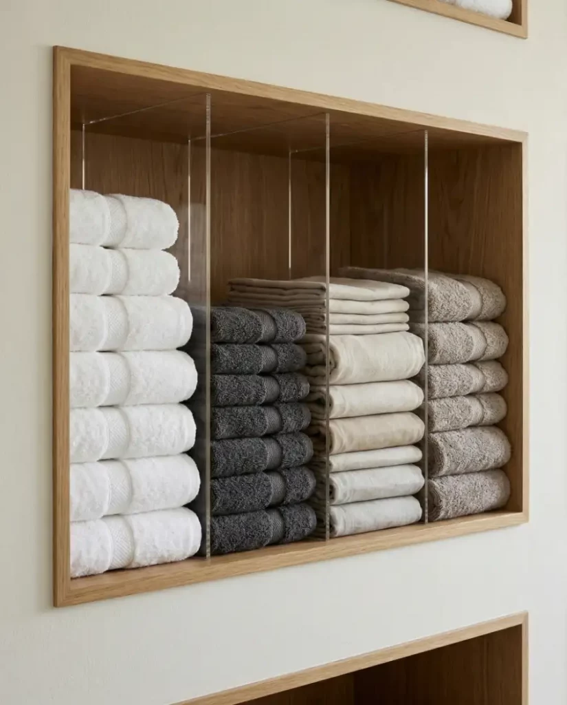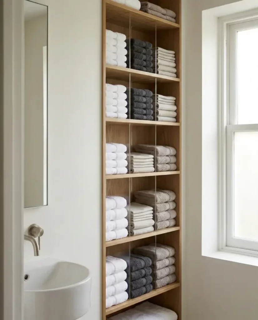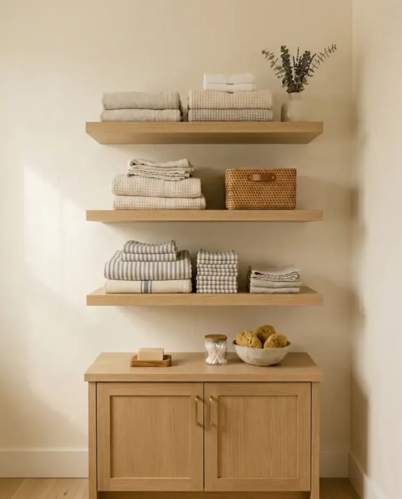 Layered shelving creates an efficient solution for towel storage for small bathroom setups. Instead of stacking thick piles, towels are arranged in smaller layers across several shelves. This approach works well for bathroom storage where linens are used daily.