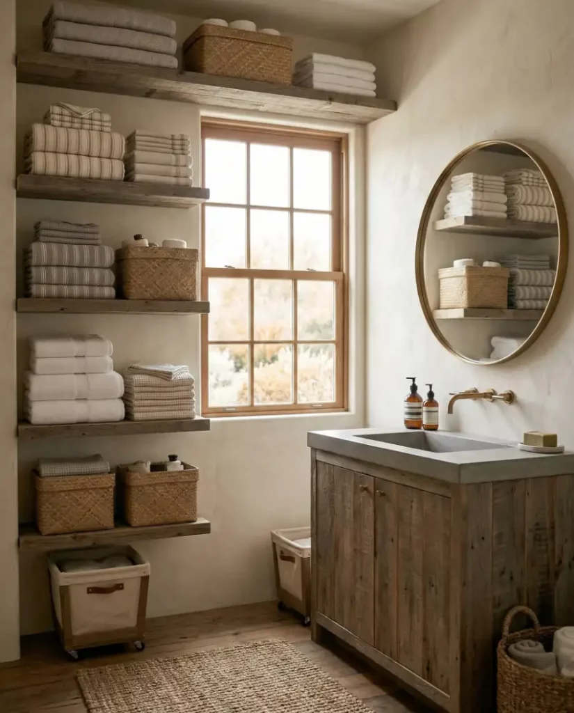 When a home lacks a traditional linen closet, bathroom shelves can double as practical linen storage. Floating shelves above cabinets or next to mirrors provide space for folded towels and essentials. This method works especially well for towel storage for small bathroom layouts.