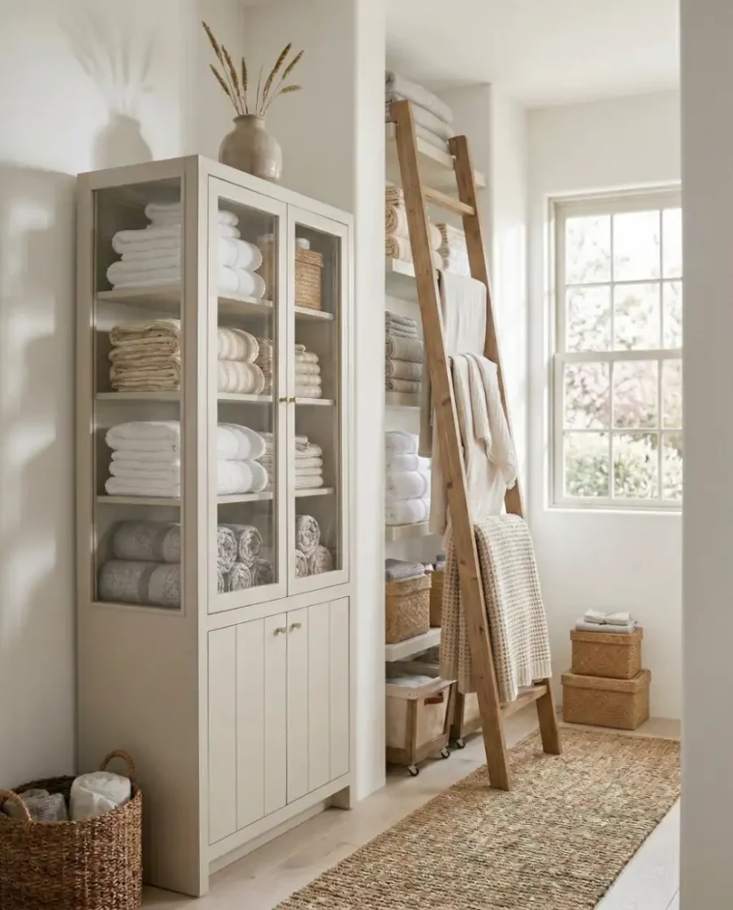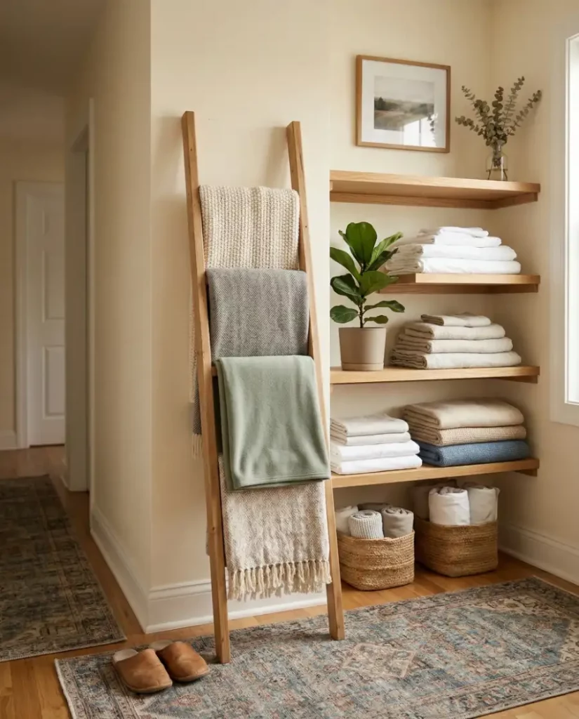 A compact ladder placed inside or beside a linen closet offers a stylish solution for storing blankets. Often seen in modern interiors, these ladders lean gently against the wall and keep bulky linens visible yet tidy. In homes with limited closet depth, this approach works well in shared spaces like guest hallways.