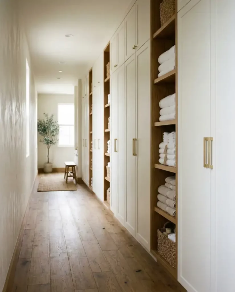 In many homes, unused wall space in hallways can be transformed into sleek hallways built ins that store linens beautifully. Shallow cabinetry or recessed shelving offers extra storage without intruding into walking space. This approach works especially well in long corridors where a traditional linen closet may not fit.