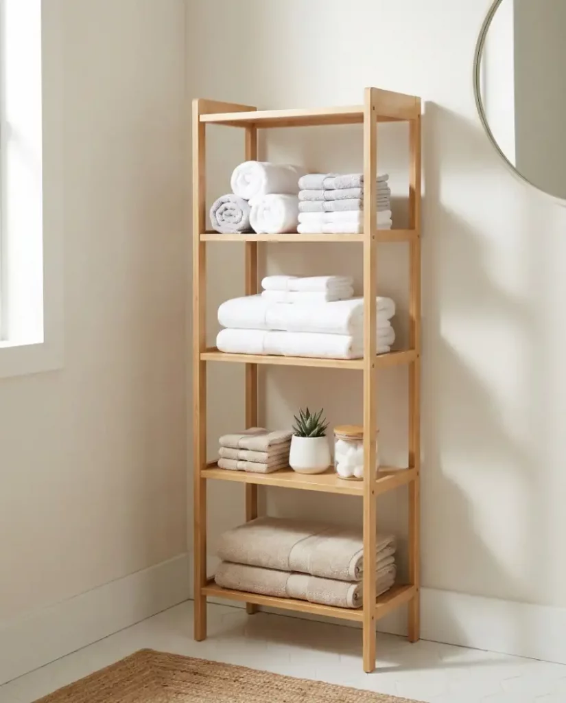 Budget-wise, many homeowners start with affordable vertical shelving units before investing in custom cabinetry. Even a simple freestanding shelf can dramatically increase usable linen storage in a compact bathroom.