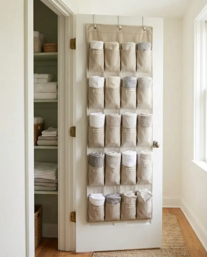 The back of a closet door is often overlooked, yet it can provide valuable storage for homes with small spaces. Slim racks or pocket organizers help store extra pillowcases, hand towels, and toiletries without crowding shelves. In a compact hall or linen cabinet, this vertical trick instantly adds practical storage where none existed before.
