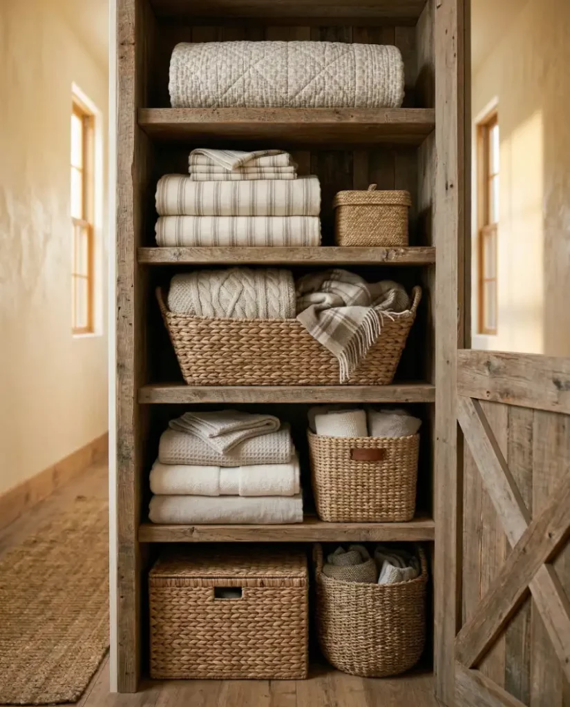5. Farmhouse Linen Storage with Woven Baskets