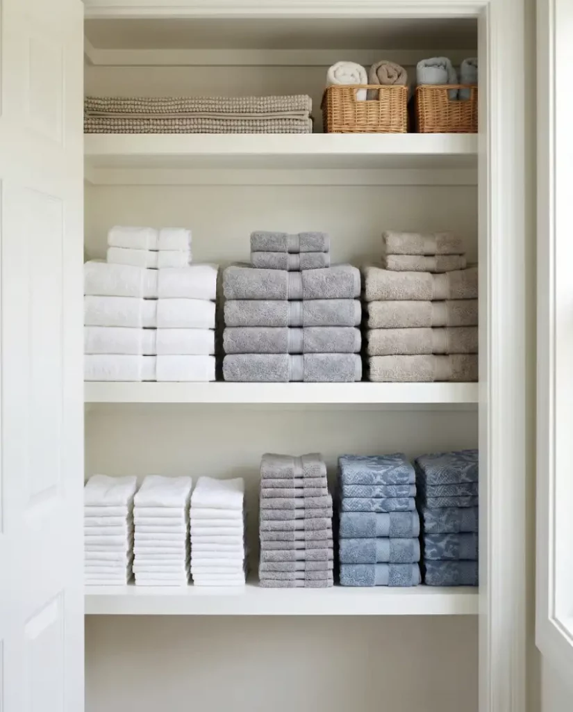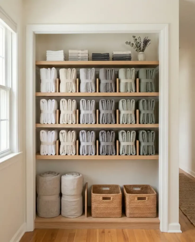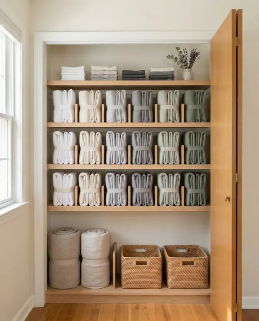 Shelf dividers are a simple upgrade that can dramatically improve closet organization. By separating stacks of towels, sheets, and blankets, dividers prevent linens from collapsing into each other. This approach works well in shared spaces where multiple family members reach for linens throughout the week.