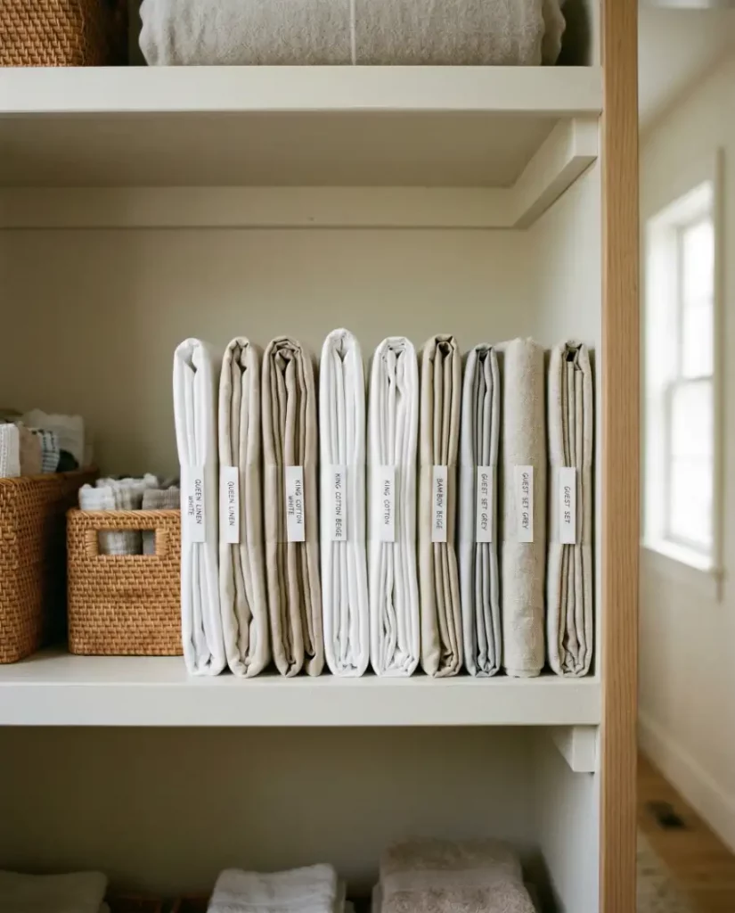 The fold-and-file system is gaining popularity for people who want to easily organize sheets. Instead of stacking sets horizontally, linens are folded into compact rectangles and stored vertically on bathroom shelves or closet shelves. This technique works particularly well in small spaces because every set stays visible.